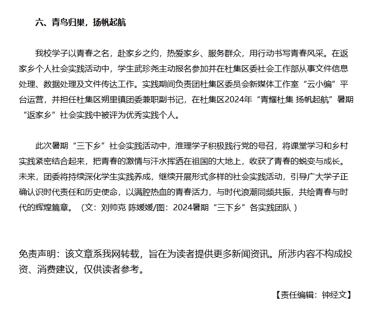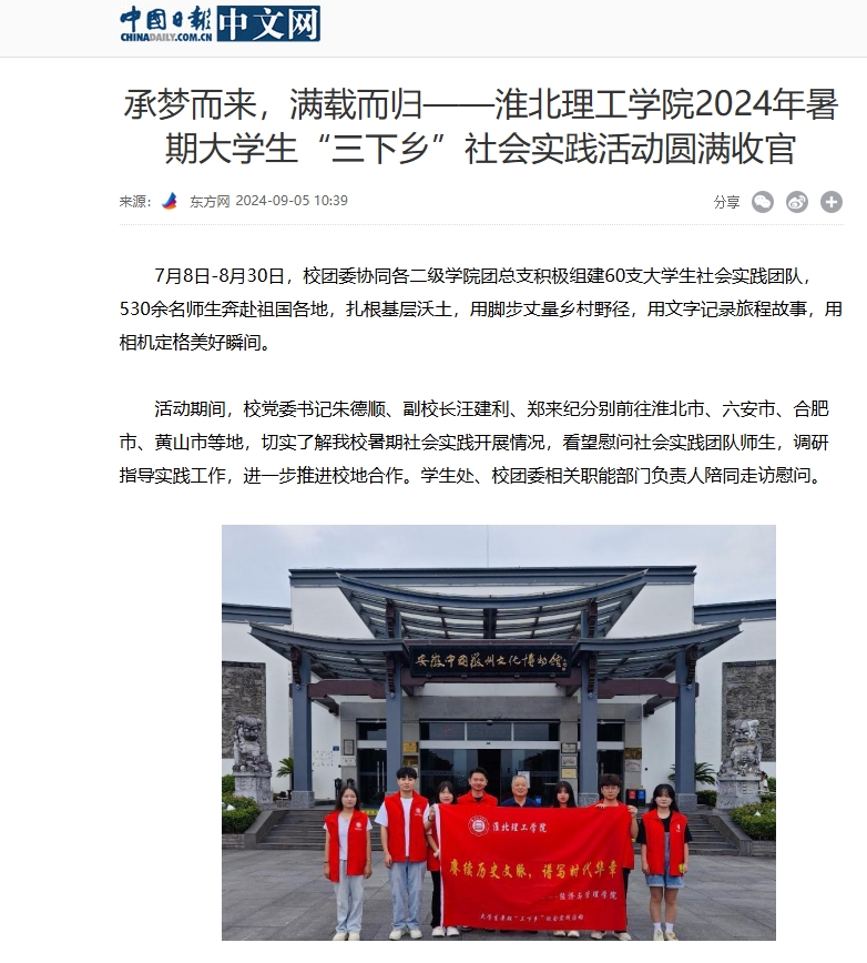 7月8日-8月30日,beat365唯一官方网站校团委协同各二级学院团总支积极组建60支大学生社会实践团队,530余名师生奔赴祖国各地,扎根基层沃土,用脚步丈量乡村野径,用文字记录旅程故事,用相机定格美好瞬间。对此,中国日报网进行了报道: