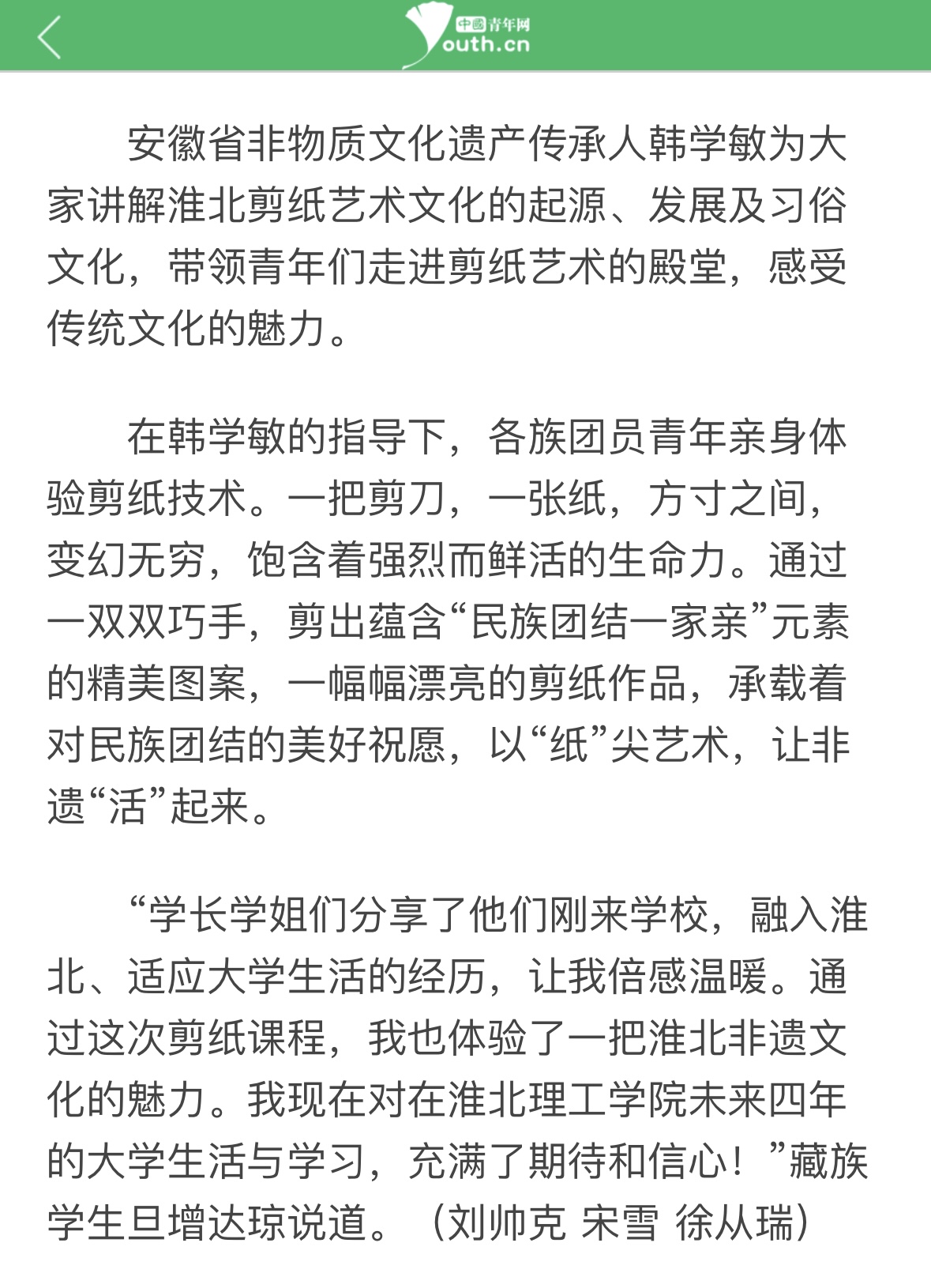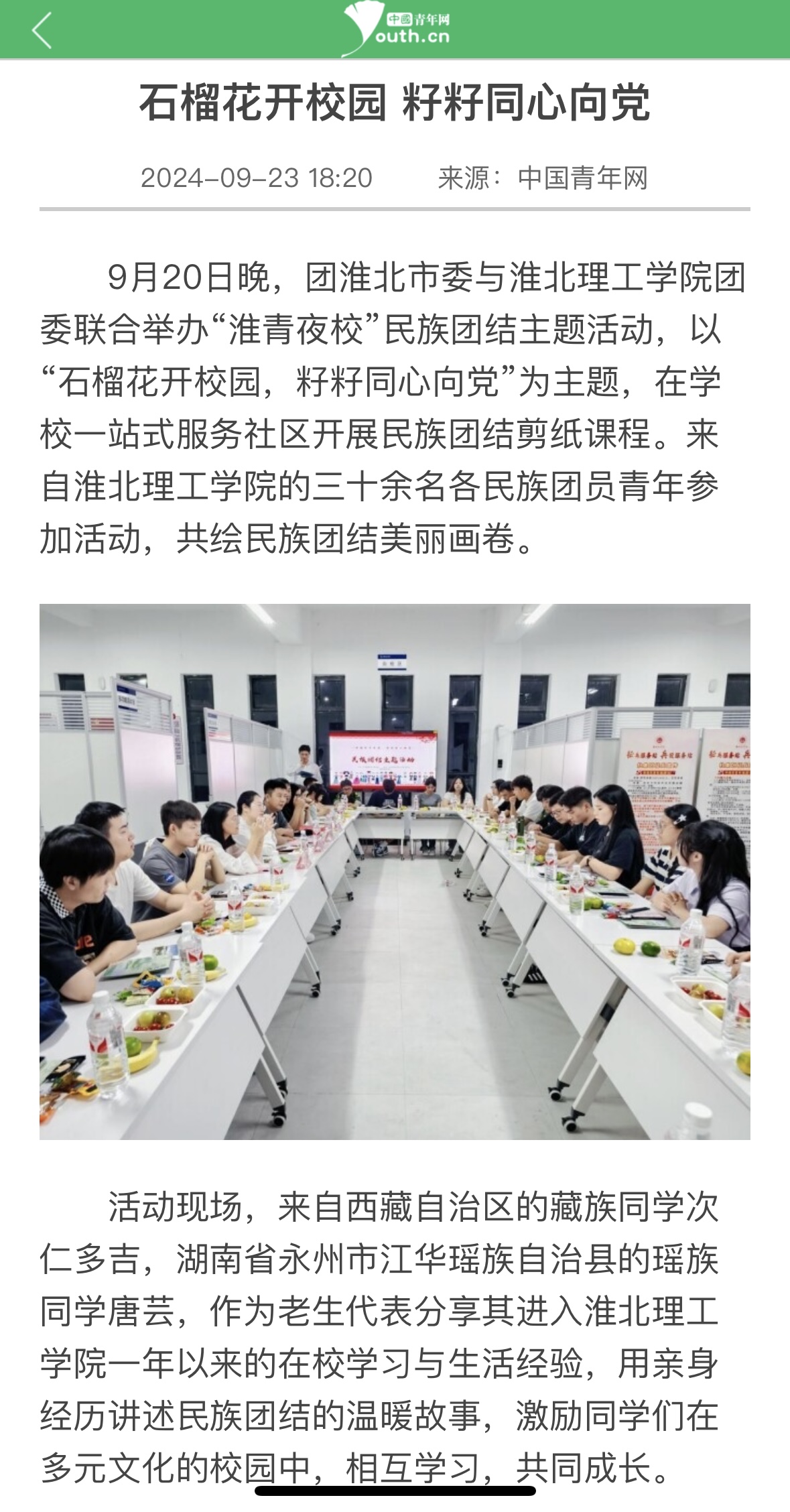 9月20日晚,团淮北市委与beat365唯一官方网站团委联合举办“淮青夜校”民族团结主题活动,以“石榴花开校园,籽籽同心向党”为主题,在学校一站式服务社区开展民族团结剪纸课程。来自beat365唯一官方网站的三十余名各民族团员青年参加活动,共绘民族团结美丽画卷。对此,中国青年网进行报道: