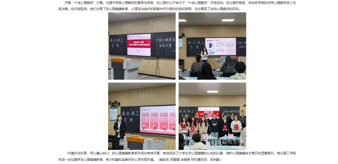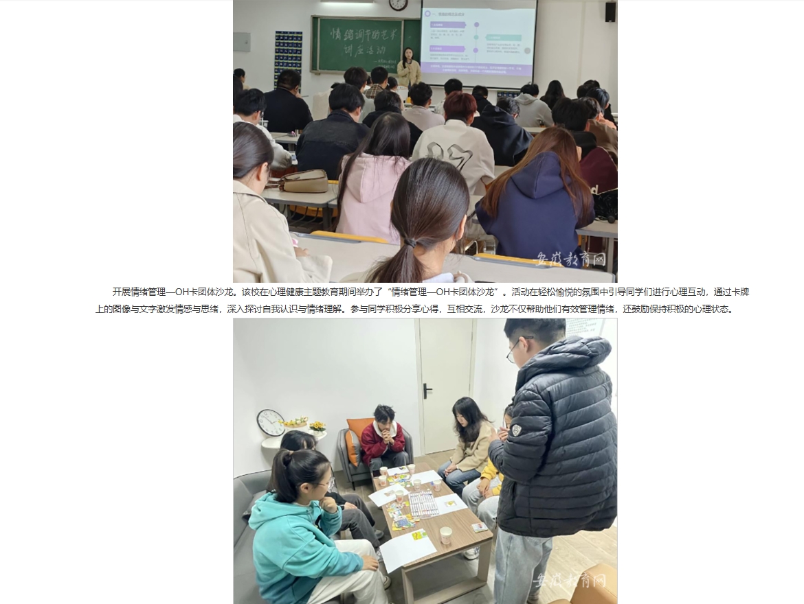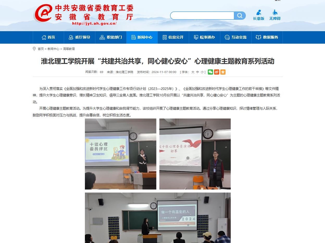 为深入贯彻落实《全面加强和改进新时代学生心理健康工作专项行动计划(2023—2025年)》、《全面加强和改进新时代学生心理健康工作的若干举措》等文件精神,提升大学生心理健康意识,增长精神卫生知识,倡导三全育人氛围。beat365唯一官方网站10月份开展以“共建共治共享,同心健心安心”为主题的心理健康主题教育系列活动。对此,安徽教育网进行了报道: