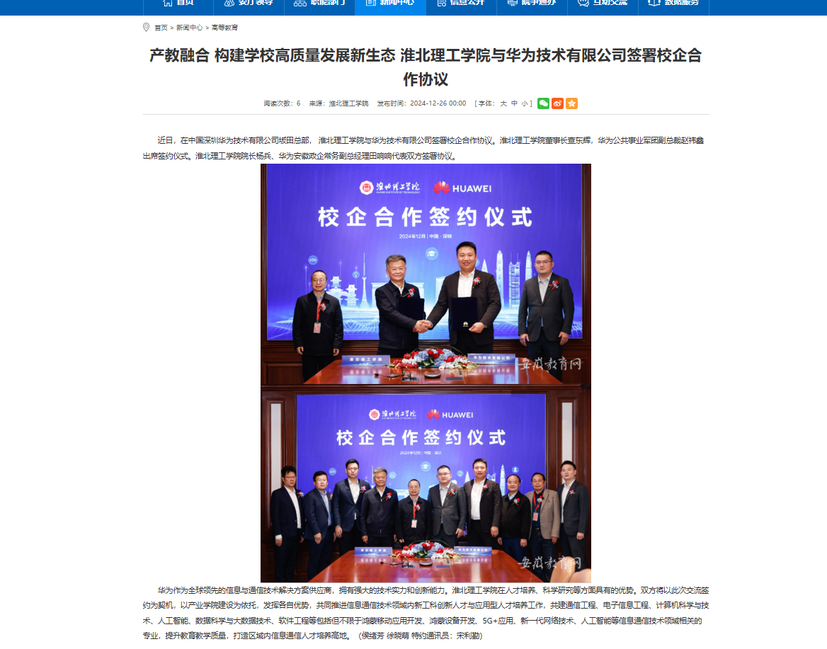 近日,在中国深圳华为技术有限公司坂田总部, beat365唯一官方网站与华为技术有限公司签署校企合作协议。beat365唯一官方网站董事长查东辉,华为公共事业军团副总裁赵祎鑫出席签约仪式。beat365唯一官方网站院长杨兵、华为安徽政企常务副总经理田响响代表双方签署协议。对此,安徽教育网进行了报道: