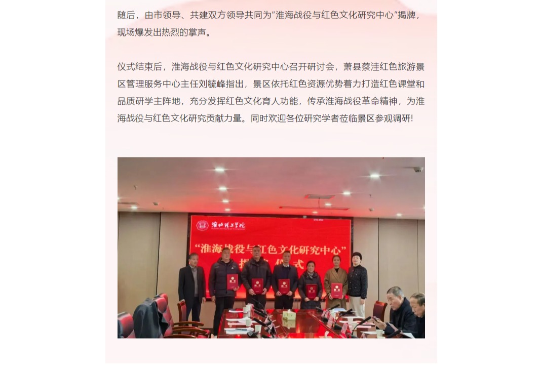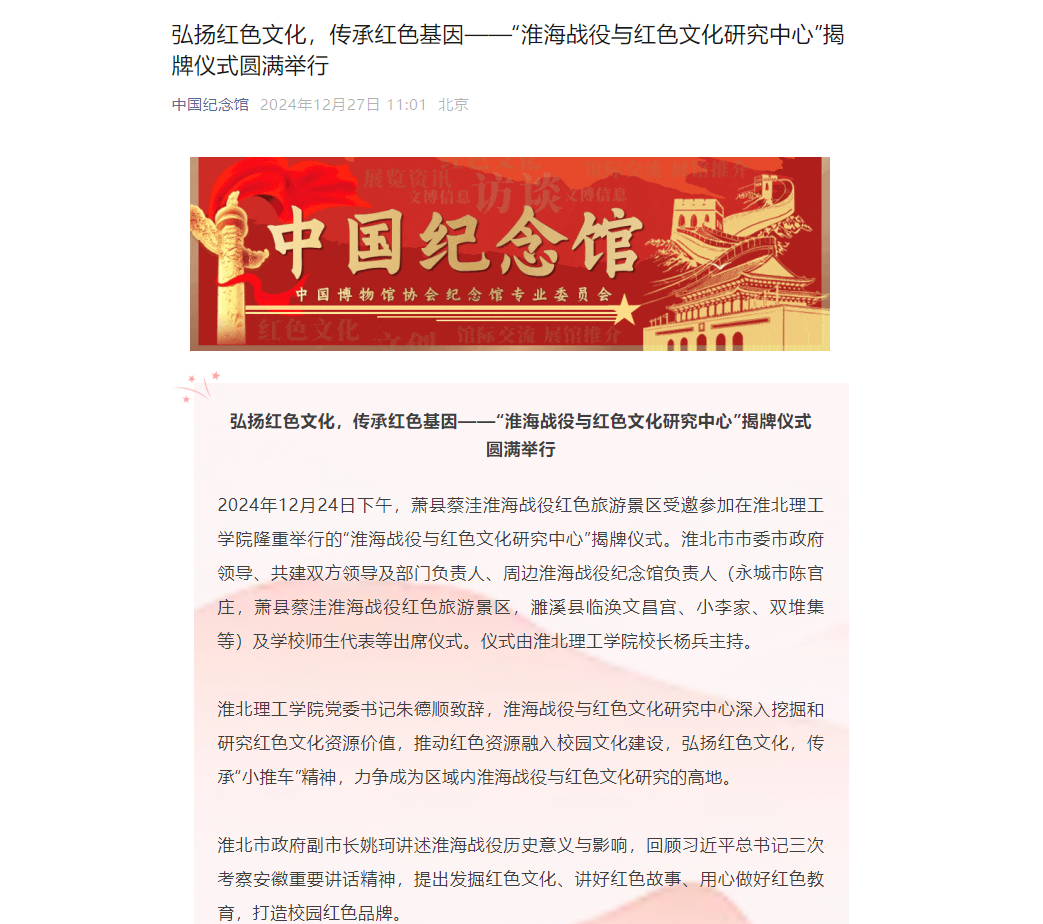 2024年12月24日下午,萧县蔡洼淮海战役红色旅游景区受邀参加在beat365唯一官方网站隆重举行的“淮海战役与红色文化研究中心”揭牌仪式。淮北市市委市政府领导、共建双方领导及部门负责人、周边淮海战役纪念馆负责人(永城市陈官庄,萧县蔡洼淮海战役红色旅游景区,濉溪县临涣文昌宫、小李家、双堆集等)及学校师生代表等出席仪式。仪式由beat365唯一官方网站校长杨兵主持。对此,中国纪念馆进行了报道: