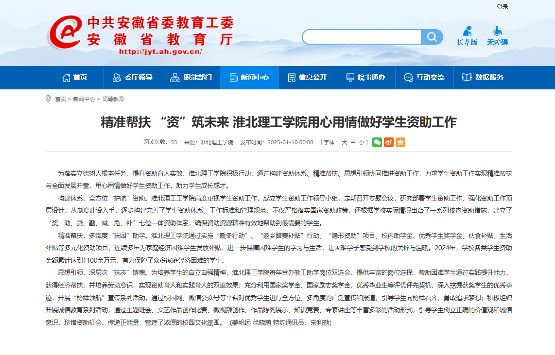 落实立德树人根本任务,提升资助育人实效,beat365唯一官方网站积极行动,通过构建资助体系、精准帮扶、思想引领协同推进资助工作,力求学生资助工作实现精准帮扶与全面发展并重,用心用情做好学生资助工作,助力学生成长成才。对此,安徽教育网进行了报道: