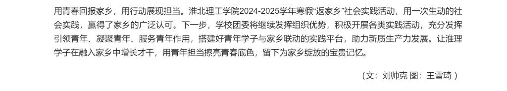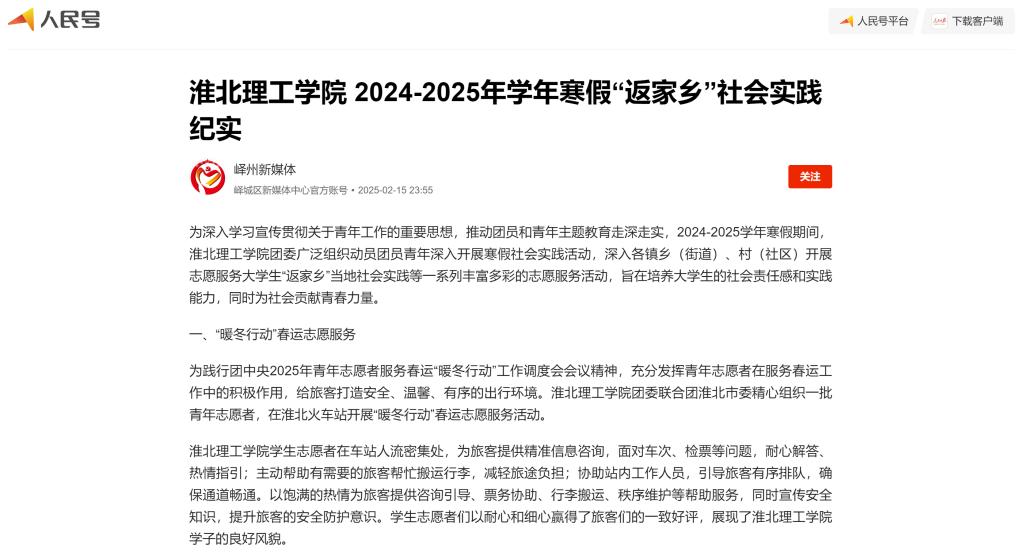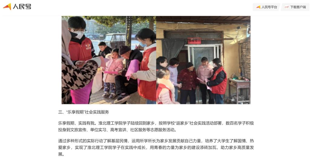 为深入学习宣传贯彻关于青年工作的重要思想,推动团员和青年主题教育走深走实,2024-2025学年寒假期间,beat365唯一官方网站团委广泛组织动员团员青年深入开展寒假社会实践活动,深入各镇乡(街道)、村(社区)开展志愿服务大学生“返家乡”当地社会实践等一系列丰富多彩的志愿服务活动,旨在培养大学生的社会责任感和实践能力,同时为社会贡献青春力量。对此,人民日报人民号进行了报道: