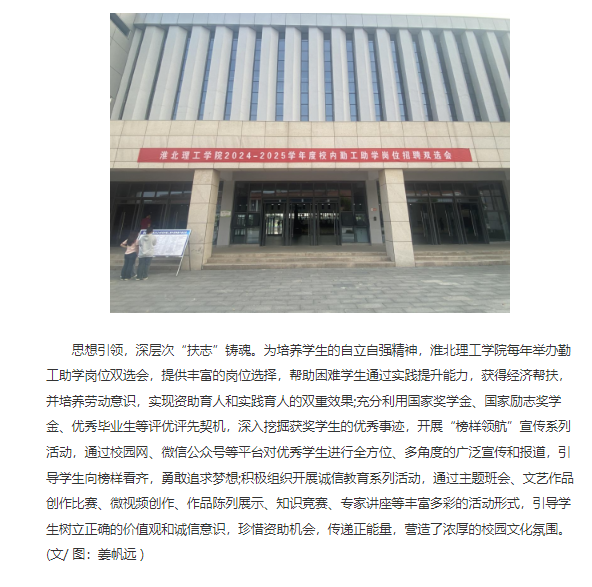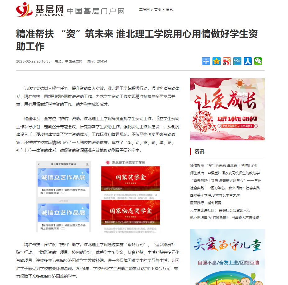 为落实立德树人根本任务,提升资助育人实效,beat365唯一官方网站积极行动,通过构建资助体系、精准帮扶、思想引领协同推进资助工作,力求学生资助工作实现精准帮扶与全面发展并重,用心用情做好学生资助工作,助力学生成长成才。对此,基层网进行了报道: