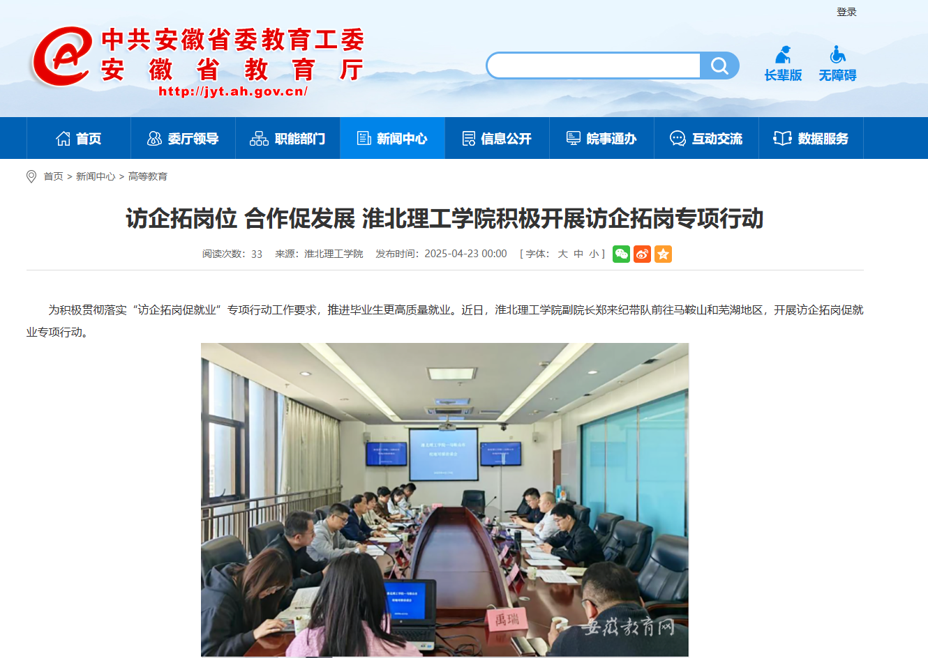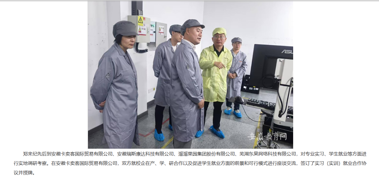 为积极贯彻落实“访企拓岗促就业”专项行动工作要求,推进毕业生更高质量就业。近日,beat365唯一官方网站副院长郑来纪带队前往马鞍山和芜湖地区,开展访企拓岗促就业专项行动。对此,安徽教育网进行了报道: