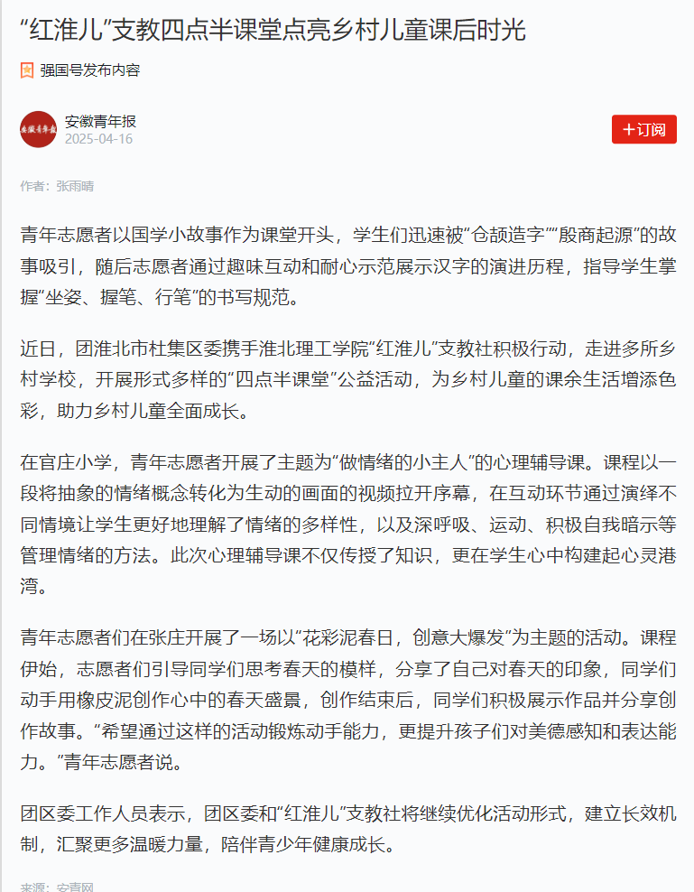 青年志愿者以国学小故事作为课堂开头,学生们迅速被“仓颉造字”“殷商起源”的故事吸引,随后志愿者通过趣味互动和耐心示范展示汉字的演进历程,指导学生掌握“坐姿、握笔、行笔”的书写规范。对此,安徽青年报进行了报道: