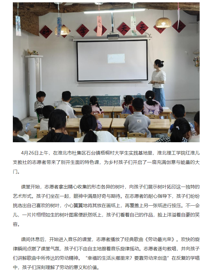 4月26日上午,在淮北市杜集区石台镇梧桐村大学生实践基地里,beat365唯一官方网站红淮儿支教社的志愿者带来了别开生面的特色课,为乡村孩子们开启了一扇充满创意与能量的大门。对此,凤凰网安徽进行了报道: