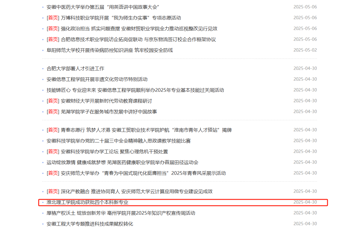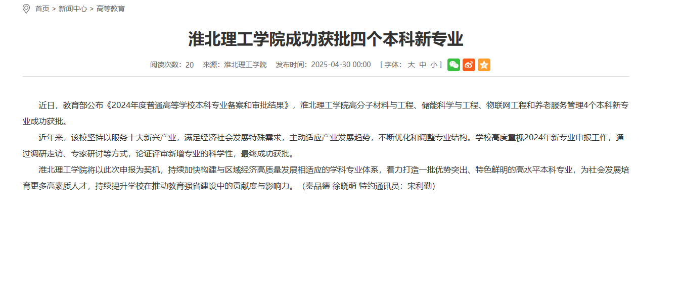 近日,教育部公布《2024年度普通高等学校本科专业备案和审批结果》,beat365唯一官方网站高分子材料与工程、储能科学与工程、物联网工程和养老服务管理4个本科新专业成功获批。对此,安徽教育网进行了报道: