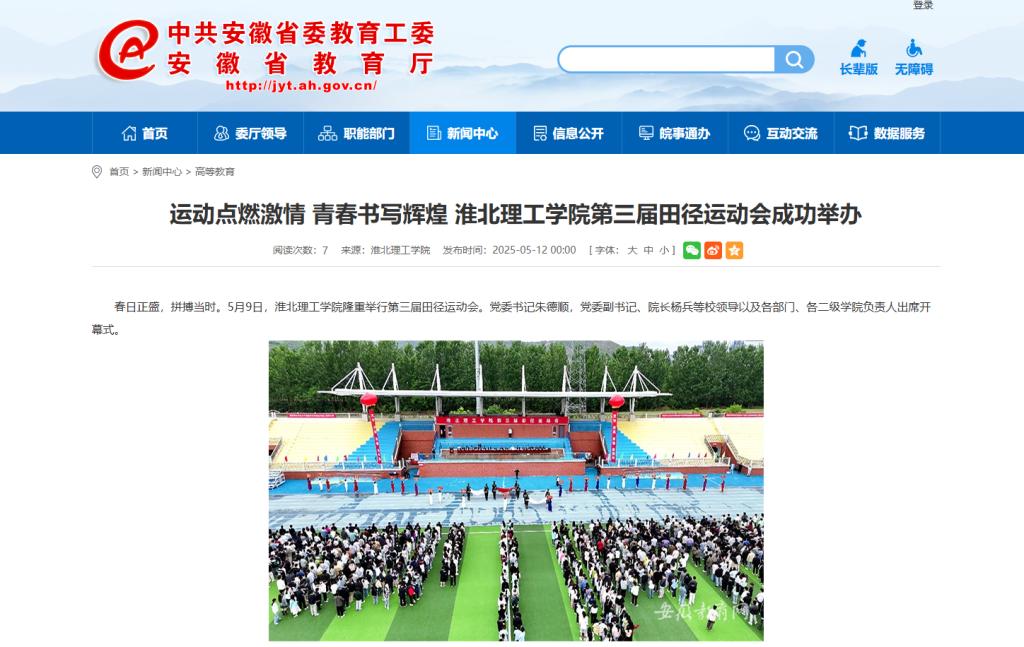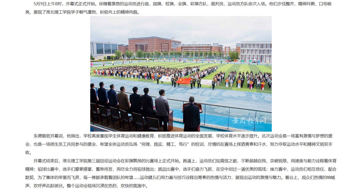 春日正盛,拼搏当时。5月9日,beat365唯一官方网站隆重举行第三届田径运动会。党委书记朱德顺,党委副书记、院长杨兵等校领导以及各部门、各二级学院负责人出席开幕式。对此,安徽教育网进行了报道: