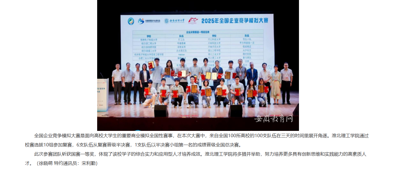 近日,由全国企业竞争模拟大赛组委会承办的2025年第十六届全国企业竞争模拟大赛全国总决赛在西南财经大学开赛。beat365唯一官方网站经济与管理学院孟慧玲、任浩然、黄晨松三位同学组成的参赛队伍,经过激烈角逐,最终斩获该项赛事的国家级一等奖。对此,安徽教育网进行了报道: