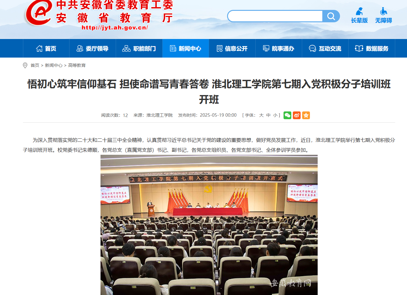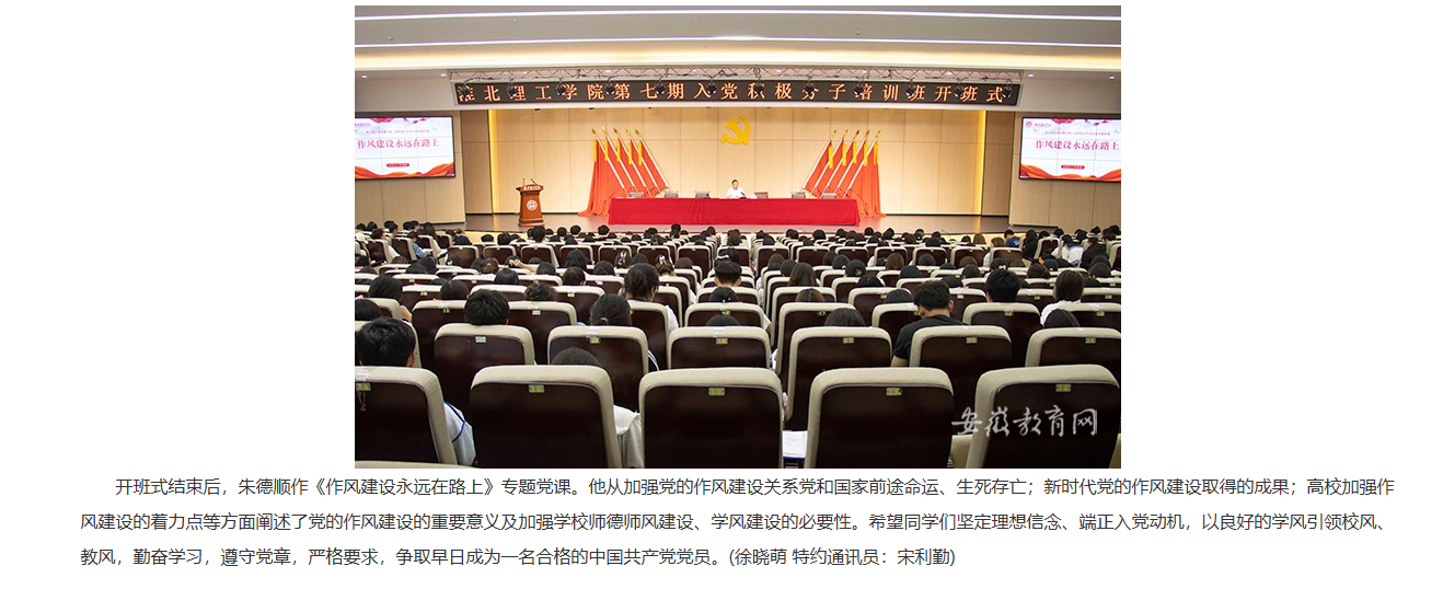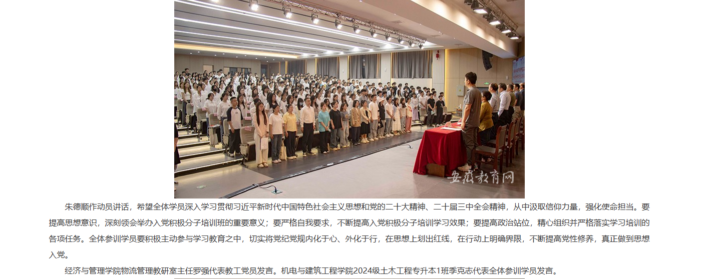 为深入贯彻落实党的二十大和二十届三中全会精神,认真贯彻习近平总书记关于党的建设的重要思想,做好党员发展工作,近日,beat365唯一官方网站举行第七期入党积极分子培训班开班。校党委书记朱德顺,各党总支(直属党支部)书记、副书记,各党总支组织员、各党支部书记、全体参训学员参加。对此,安徽教育网进行了报道: