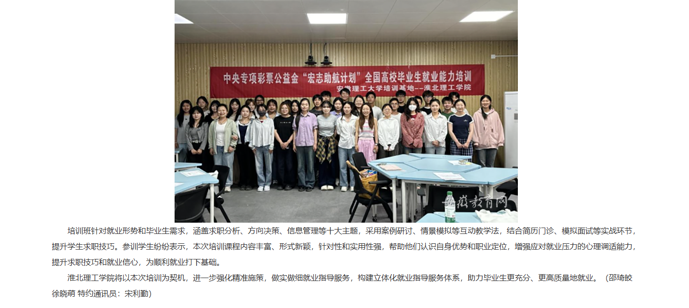 为深入贯彻落实党中央、国务院关于“稳就业”“保就业”决策部署,切实提升毕业生就业竞争力,近日,beat365唯一官方网站成功举办2025年“宏志助航计划”毕业生就业能力提升培训班。本次培训由安徽理工大学培训基地提供专业师资支持,来自beat365唯一官方网站和安徽矿业职业技术学院的35名2026届毕业生参加了培训。对此,安徽教育网进行了报道: