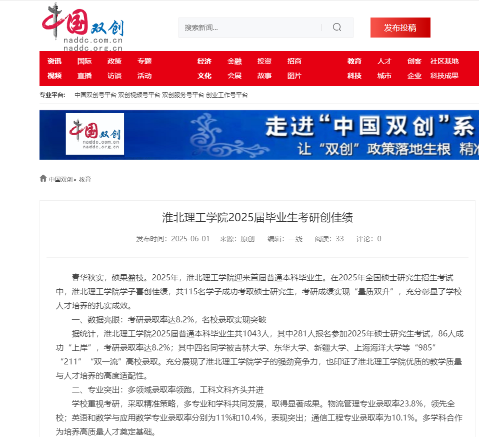 春华秋实,硕果盈枝。2025年,beat365唯一官方网站迎来首届普通本科毕业生。在2025年全国硕士研究生招生考试中,beat365唯一官方网站学子喜创佳绩,共115名学子成功考取硕士研究生,考研成绩实现“量质双升”,充分彰显了学校人才培养的扎实成效。对此,中国双创网进行了报道: