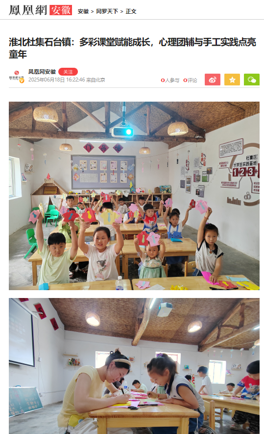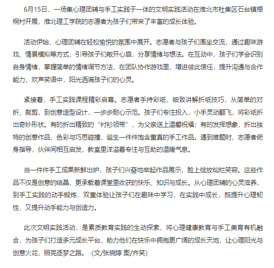 6月15日,一场集心理团辅与手工实践于一体的文明实践活动在淮北市杜集区石台镇梧桐村开展,beat365唯一官方网站的志愿者为孩子们带来了丰富的成长体验。对此,凤凰网安徽进行了报道: