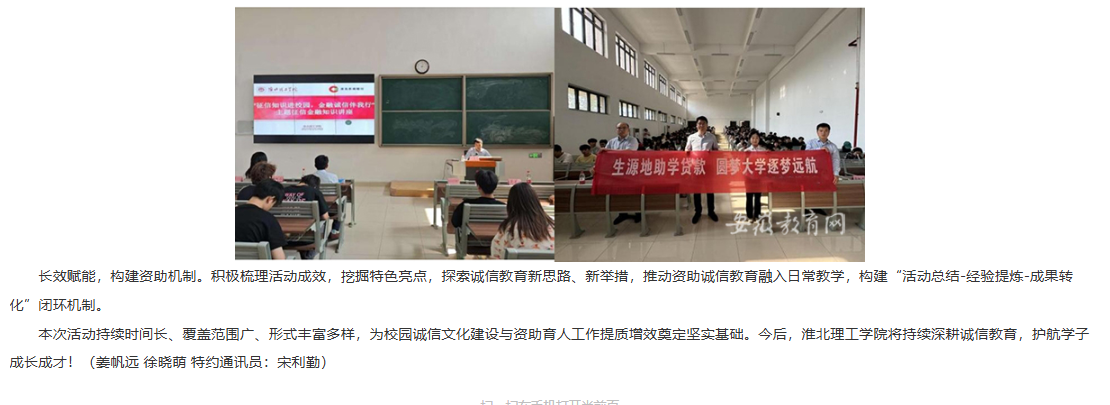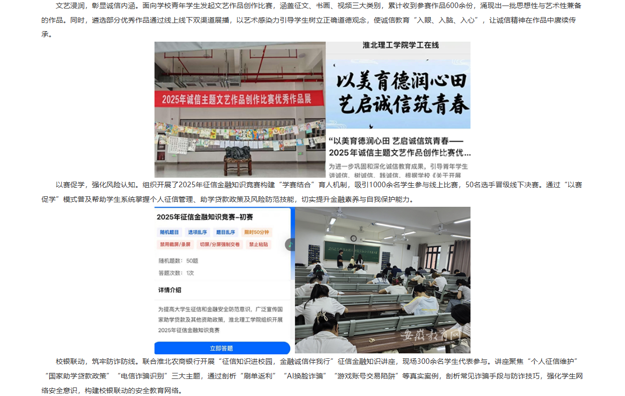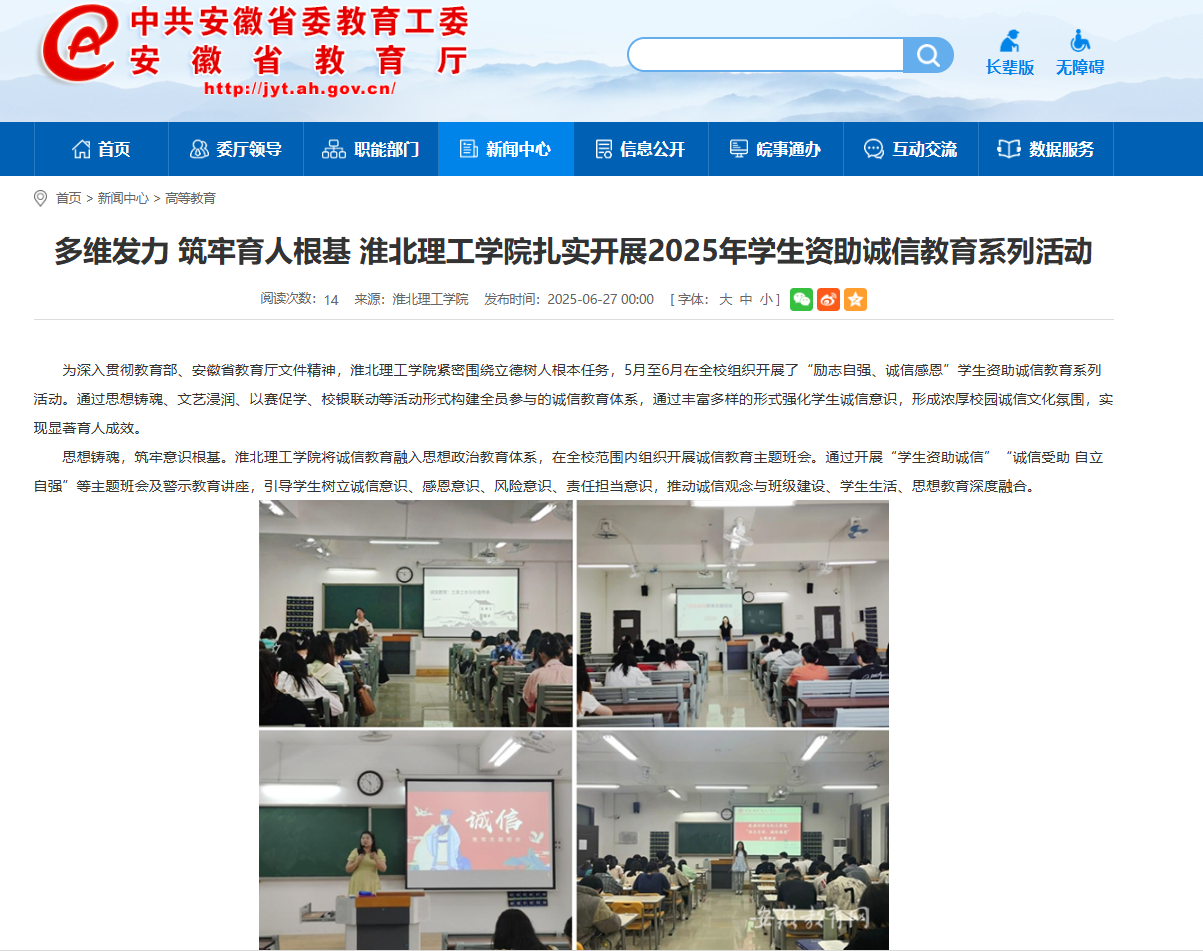 为深入贯彻教育部、安徽省教育厅文件精神,beat365唯一官方网站紧密围绕立德树人根本任务,5月至6月在全校组织开展了“励志自强、诚信感恩”学生资助诚信教育系列活动。通过思想铸魂、文艺浸润、以赛促学、校银联动等活动形式构建全员参与的诚信教育体系,通过丰富多样的形式强化学生诚信意识,形成浓厚校园诚信文化氛围,实现显著育人成效。对此,安徽教育网进行了报道: