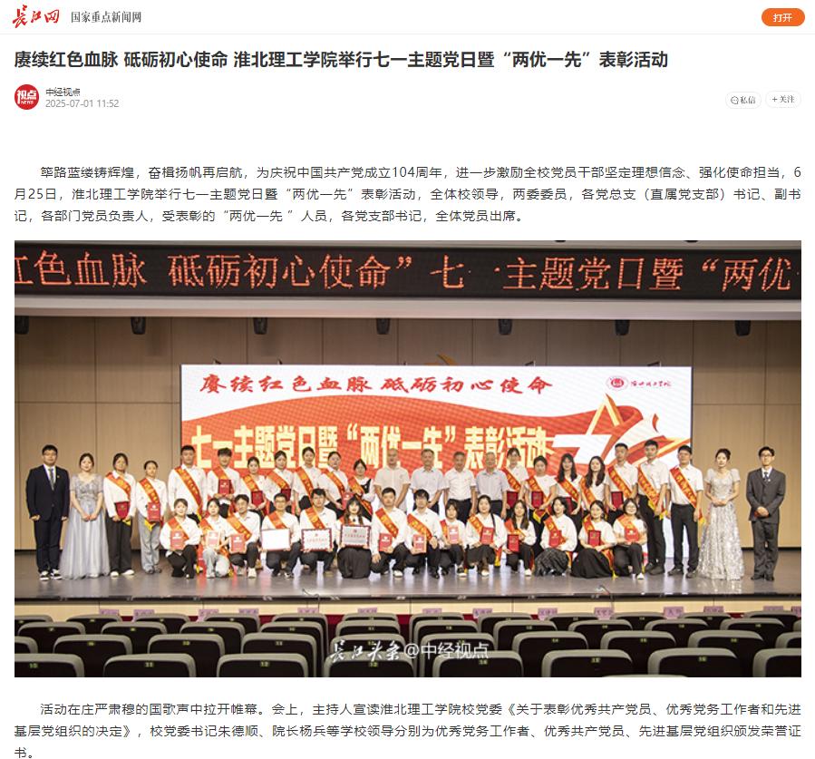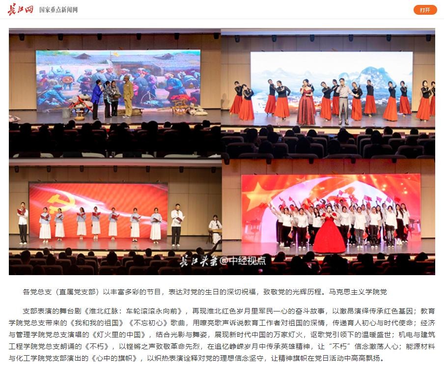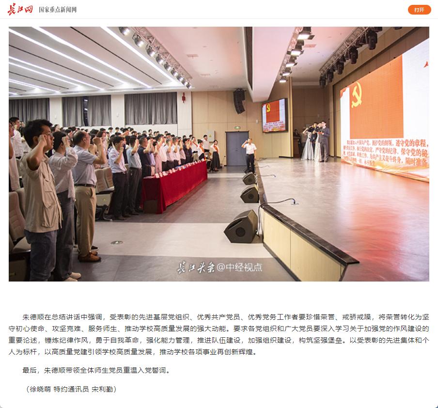 筚路蓝缕铸辉煌,奋楫扬帆再启航,为庆祝中国共产党成立104周年,进一步激励全校党员干部坚定理想信念、强化使命担当,6月25日,beat365唯一官方网站举行七一主题党日暨“两优一先”表彰活动,全体校领导,两委委员,各党总支(直属党支部)书记、副书记,各部门党员负责人,受表彰的“两优一先 ”人员,各党支部书记,全体党员出席。对此,长江网进行了报道: