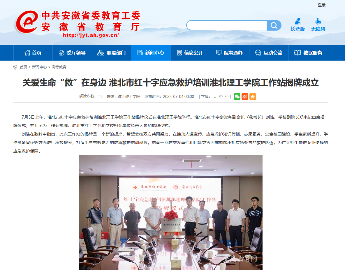 7月3日上午,淮北市红十字应急救护培训beat365唯一官方网站工作站揭牌仪式在beat365唯一官方网站举行。淮北市红十字会常务副会长(秘书长)刘浩、学校副院长郑来纪出席揭牌仪式,并共同为工作站揭牌。淮北市红十字会和学校相关单位负责人参加揭牌仪式。对此,安徽教育网进行了报道:
