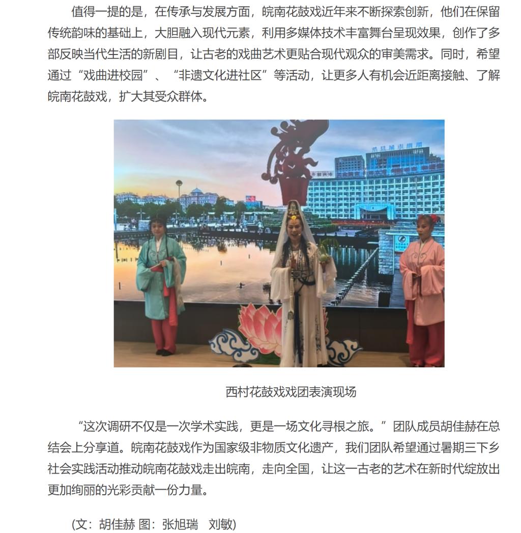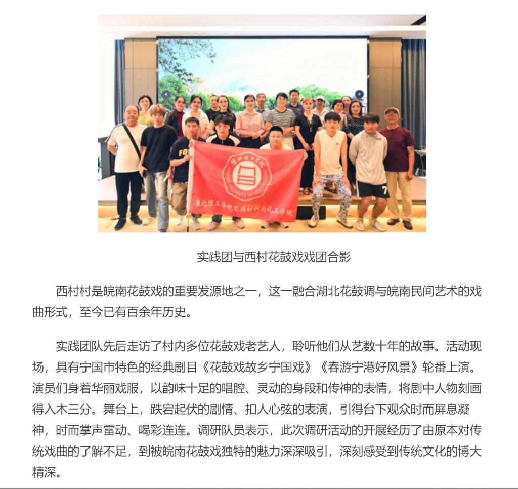 7月6日,beat365唯一官方网站能源材料与化工学院的7名同学前往宣城市宁国市港口镇西村村,开展以“寻根花鼓戏·筑梦西村村——皖南花鼓戏非遗传承调研行动”为主题的专题调研,重点探寻该戏曲的历史渊源、传承现状及创新发展路径,期间现场欣赏了西村花鼓戏戏团的精彩表演。对此,中华网进行了报道: