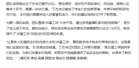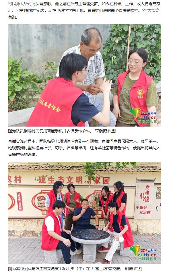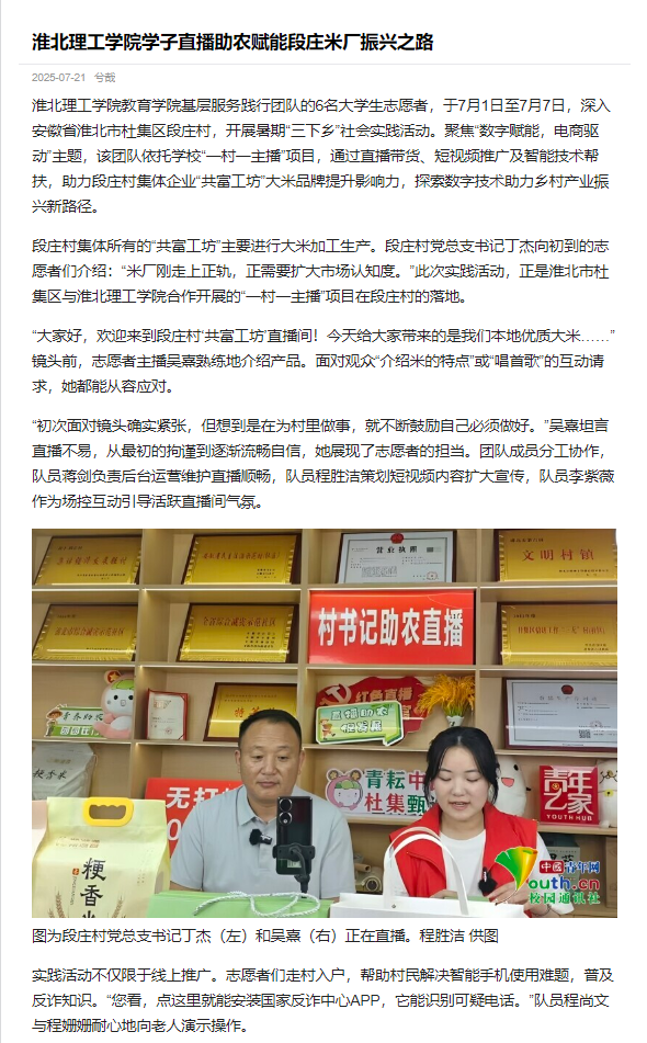 beat365唯一官方网站教育学院基层服务践行团队的6名大学生志愿者,于7月1日至7月7日,深入安徽省淮北市杜集区段庄村,开展暑期“三下乡”社会实践活动。聚焦“数字赋能,电商驱动”主题,该团队依托学校“一村一主播”项目,通过直播带货、短视频推广及智能技术帮扶,助力段庄村集体企业“共富工坊”大米品牌提升影响力,探索数字技术助力乡村产业振兴新路径。对此,中国青年网进行了报道:
