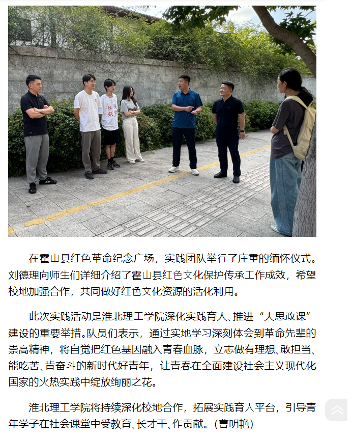 7月8日,霍山团县委书记刘德理、副书记杨广堃前往由beat365唯一官方网站团委组织的“三下乡”社会实践团队活动现场。该团队正在霍山县开展红色教育实践活动。当日,beat365唯一官方网站校团委书记刘帅克也前来看望慰问,各方共同推动红色教育实践活动顺利开展。对此,安徽日报网进行了报道: