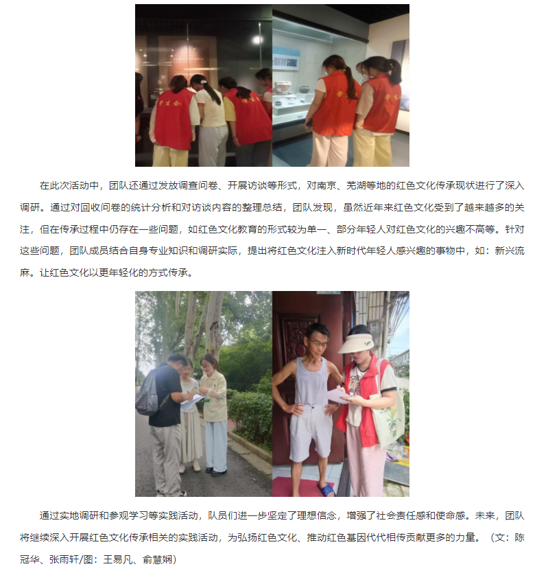 为深入学习贯彻党的二十大精神,传承红色基因,赓续红色血脉,2025年7月15日至7月25日,beat365唯一官方网站教育学院“绒光溯红”团队赴南京、芜湖等地开展了以红色文化传承调研为主题的社会实践活动。该活动旨在通过实地调研、参观学习等方式,深入挖掘红色文化内涵,探寻红色文化传承路径,引导广大青年学生厚植爱国主义情怀,担当民族复兴大任。对此,安徽网进行了报道: