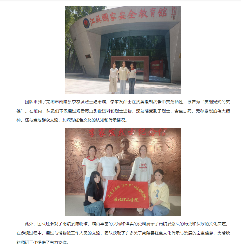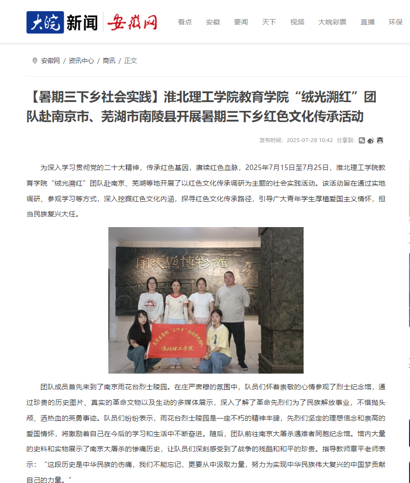 【安徽网】beat365唯一官方网站教育学院“绒光溯红”团队赴南京市、芜湖市南陵县开展暑期三下乡红色文化传承活动