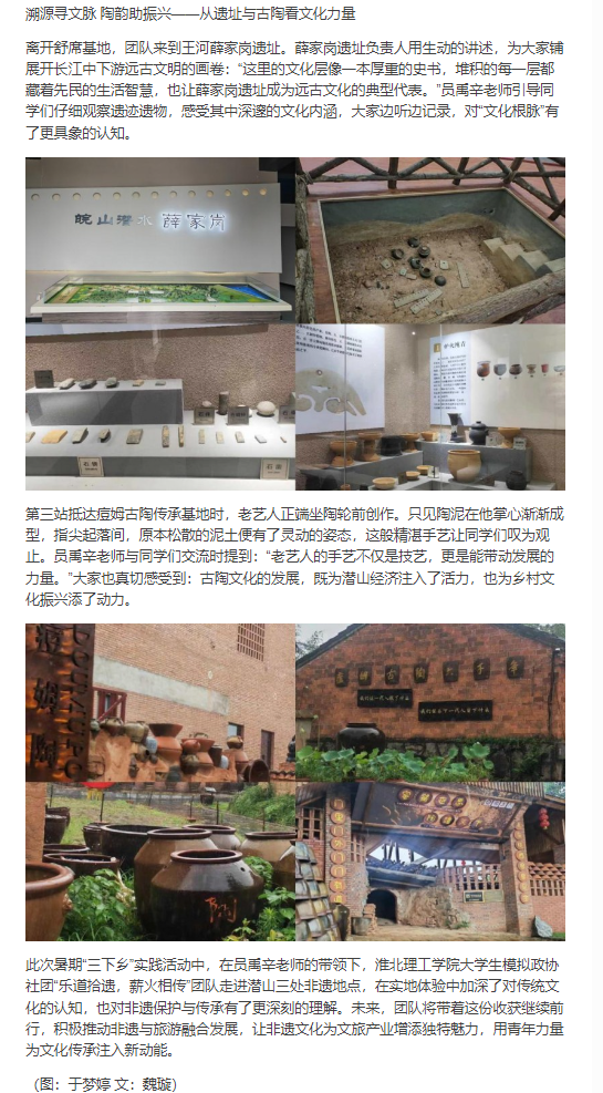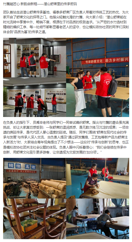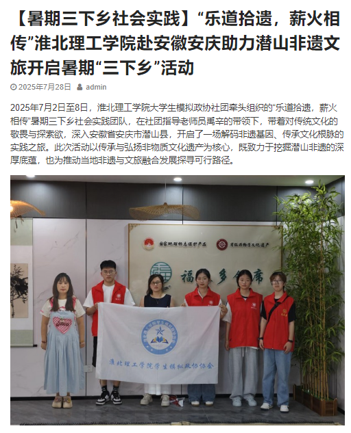 2025年7月2日至8日,beat365唯一官方网站大学生模拟政协社团牵头组织的“乐道拾遗,薪火相传”暑期三下乡社会实践团队,在社团指导老师员禹辛的带领下,带着对传统文化的敬畏与探索欲,深入安徽省安庆市潜山县,开启了一场解码非遗基因、传承文化根脉的实践之旅。此次活动以传承与弘扬非物质文化遗产为核心,既致力于挖掘潜山非遗的深厚底蕴,也为推动当地非遗与文旅融合发展探寻可行路径。对此,中国青年日报:
