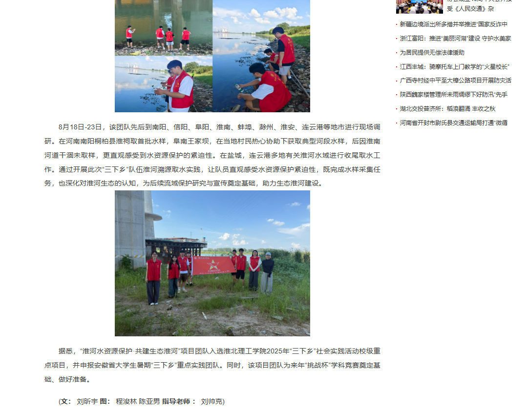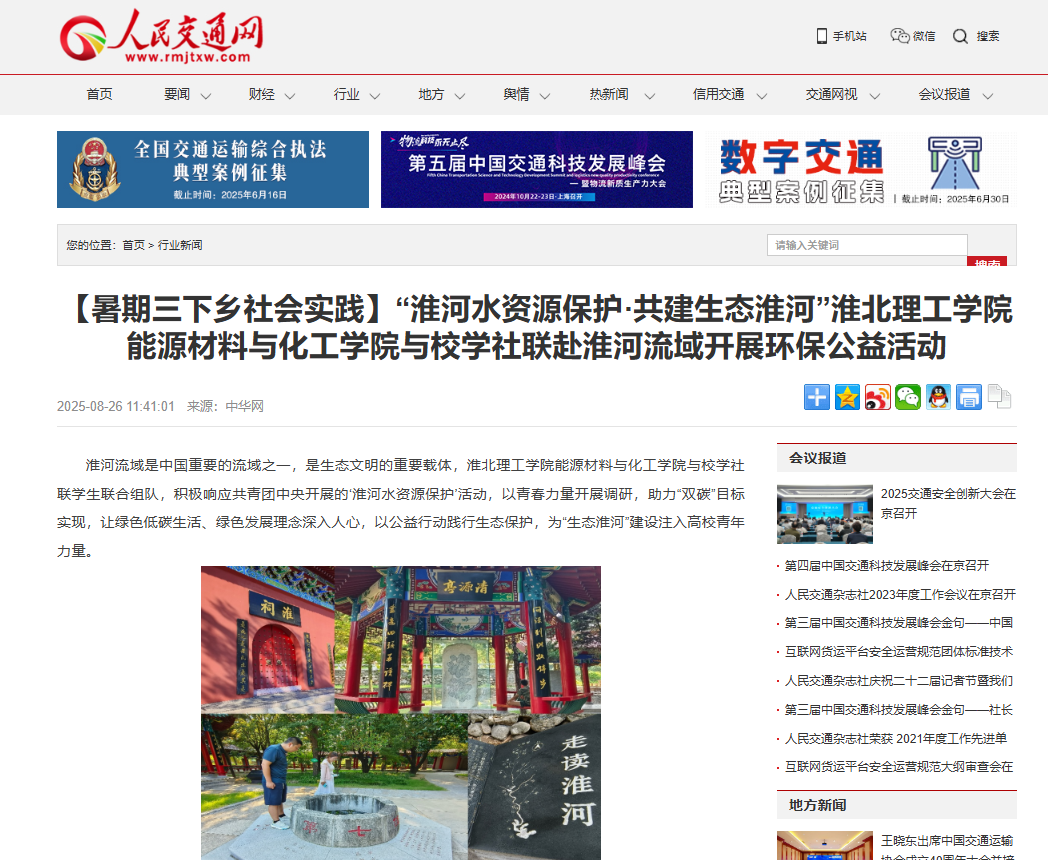 淮河流域是中国重要的流域之一,是生态文明的重要载体,beat365唯一官方网站能源材料与化工学院与校学社联学生联合组队,积极响应共青团中央开展的‘淮河水资源保护’活动,以青春力量开展调研,助力“双碳”目标实现,让绿色低碳生活、绿色发展理念深入人心,以公益行动践行生态保护,为“生态淮河”建设注入高校青年力量。对此,人民交通网进行了报道: