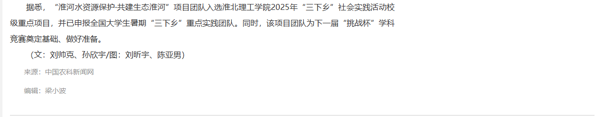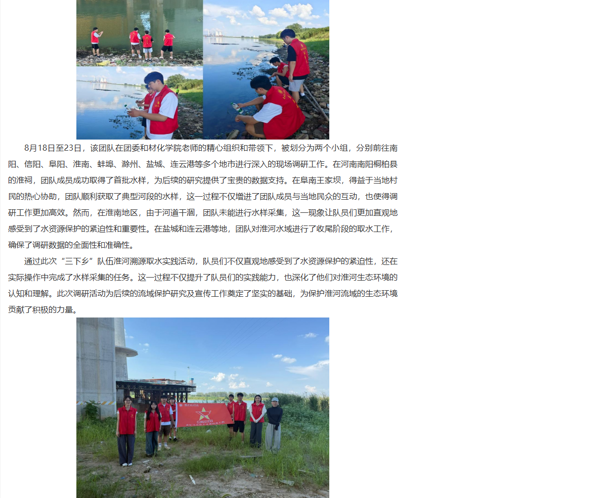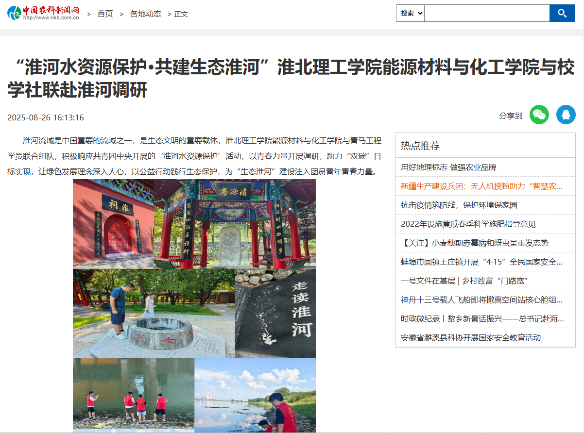 淮河流域是中国重要的流域之一,是生态文明的重要载体,beat365唯一官方网站能源材料与化工学院与青马工程学员联合组队,积极响应共青团中央开展的‘淮河水资源保护’活动,以青春力量开展调研,助力“双碳”目标实现,让绿色发展理念深入人心,以公益行动践行生态保护,为“生态淮河”建设注入团员青年青春力量。对此,中国农科新闻网进行了报道: