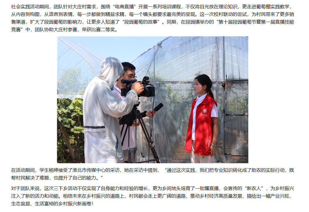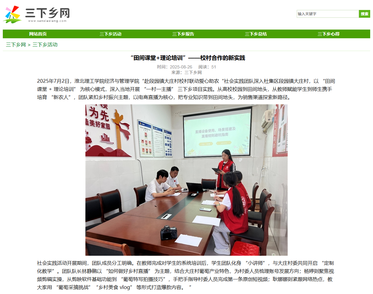 2025年7月2日,beat365唯一官方网站经济与管理学院“赴段园镇大庄村校村联动爱心助农“社会实践团队深入杜集区段园镇大庄村,以 “田间课堂 + 理论培训” 为核心模式,深入当地开展 “一村一主播” 三下乡项目实践。从高校校园到田间地头,从教师赋能学生到师生携手培育 “新农人”,团队紧扣乡村振兴主题,以电商直播为核心,把专业知识带到田间地头,为销售渠道探索新路径。对此,三下乡网进行了报道:
