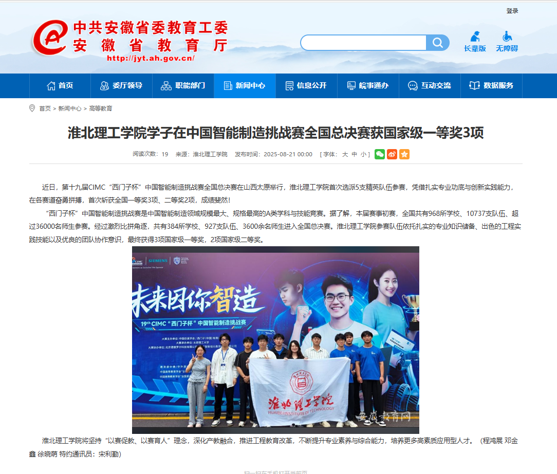 近日,第十九届CIMC“西门子杯”中国智能制造挑战赛全国总决赛在山西太原举行,beat365唯一官方网站首次选派5支精英队伍参赛,凭借扎实专业功底与创新实践能力,在各赛道奋勇拼搏,首次斩获全国一等奖3项、二等奖2项,成绩斐然!对此,安徽教育网进行了报道: