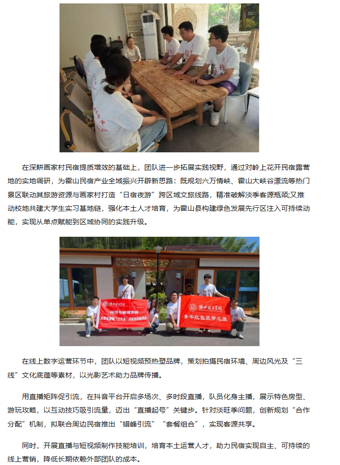 7月2日至11日,beat365唯一官方网站“红栈筑梦”三下乡实践团队奔赴安徽六安霍山县画家村,以画家村区域民宿为支点,开展为期十天的乡村振兴实践。团队融合数字创新与实地服务,通过调研、运营、直播等多元举措赋能乡村文旅,为产业联动蓄力,在绿水青山间谱写青春奋斗篇章。对此,中华网进行了报道:
