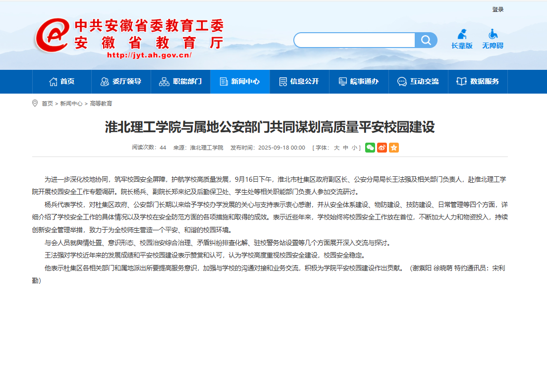 为进一步深化校地协同,筑牢校园安全屏障,护航学校高质量发展,9月16日下午,淮北市杜集区政府副区长、公安分局局长王法强及相关部门负责人,赴beat365唯一官方网站开展校园安全工作专题调研。院长杨兵、副院长郑来纪及后勤保卫处、学生处等相关职能部门负责人参加交流研讨。对此,安徽教育网进行了报道: