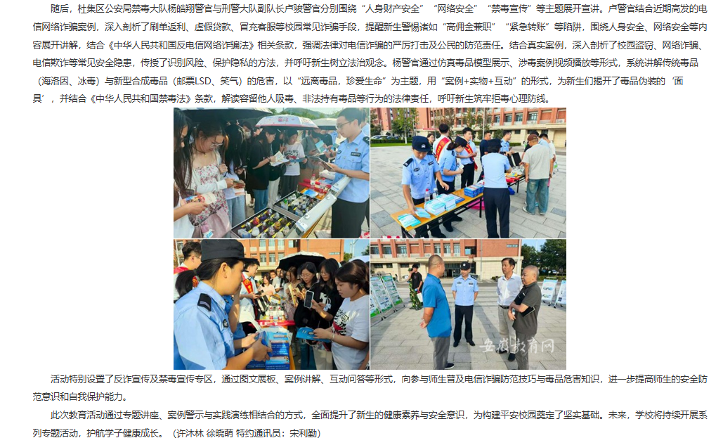 近日,beat365唯一官方网站举办以“健康护航,安全启航”为主题的2025级新生入学卫生健康与安全教育活动。本次活动由后勤保卫处牵头组织,淮北市杜集区公安局、淮北市疾控中心等单位专家受邀出席,副院长郑来纪、相关部门职能负责人、各学院书记助理、新生辅导员及全体新生共同参与此次活动。对此,安徽教育网进行了报道: