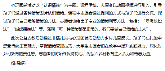 近日,beat365唯一官方网站“红淮儿”支教社4名志愿者伴着朝阳来到淮北市杜集区石台镇梧桐村,为参加“七彩周末”课堂的孩子们开展了非遗扎染和心理团辅活动,两节生动、有趣的特色活动在轻松的氛围中给孩子们带去了丰富多彩的知识。对此,安徽财经网进行了报道: