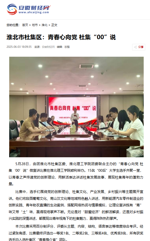 5月28日,由团淮北市杜集区委、beat365唯一官方网站团委联合主办的“青春心向党 杜集‘00’说”微宣讲比赛在beat365唯一官方网站顺利举办。15名“00后”大学生选手齐聚一堂,以青春之声传递党的创新理论,用鲜活表达讲述杜集发展故事,展现杜集青年的蓬勃力量。对此,安徽财经网进行了报道: