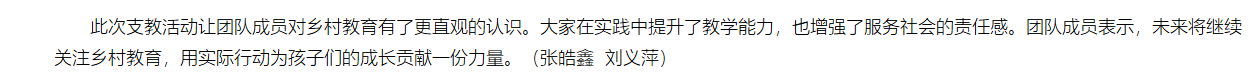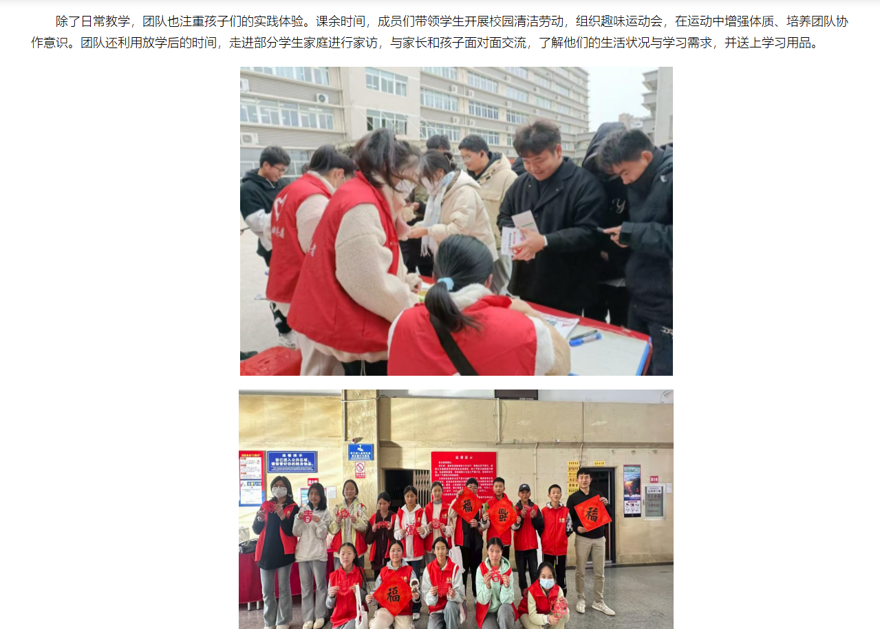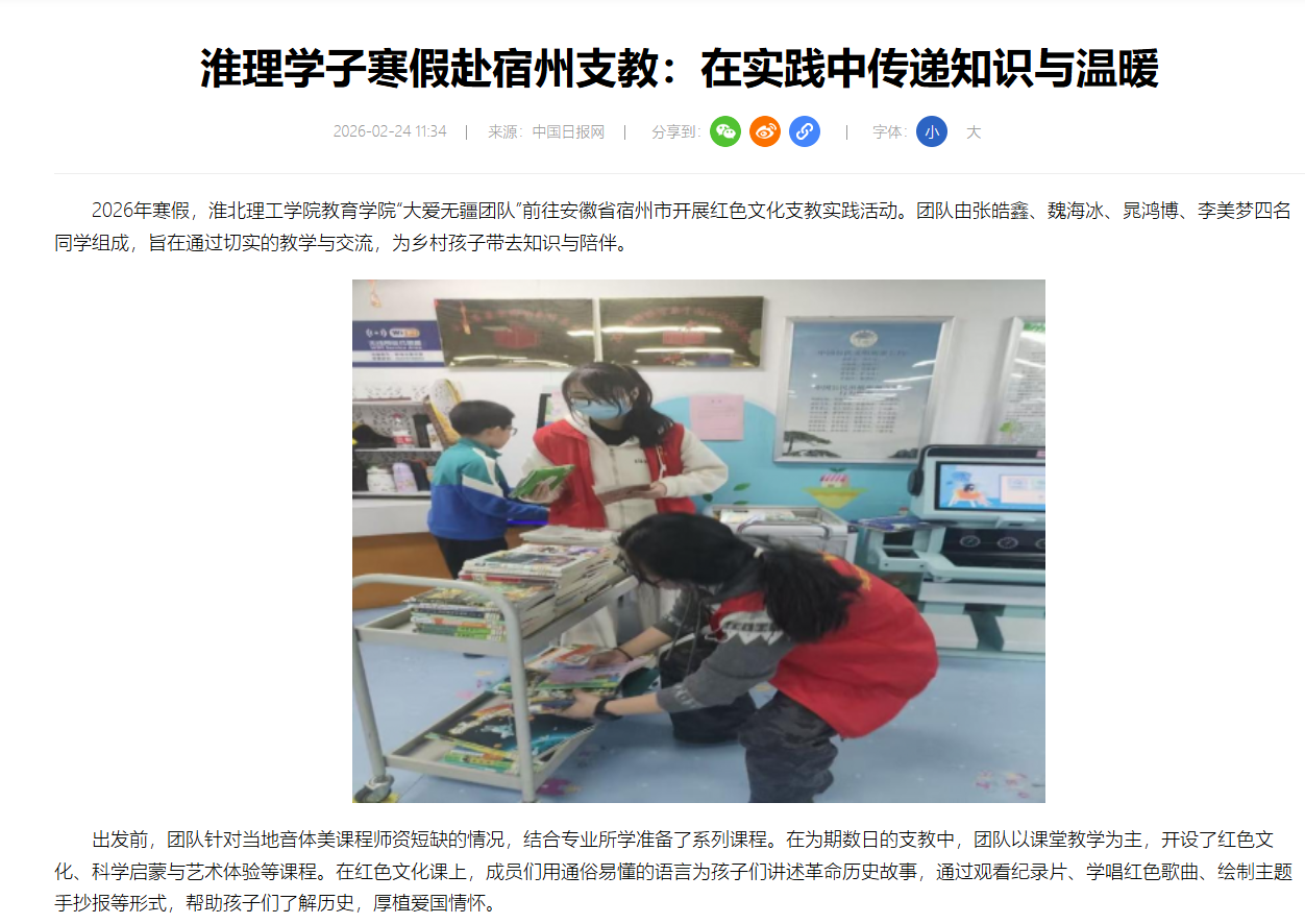 2026年寒假,beat365唯一官方网站教育学院“大爱无疆团队”前往安徽省宿州市开展红色文化支教实践活动。团队由张皓鑫、魏海冰、晁鸿博、李美梦四名同学组成,旨在通过切实的教学与交流,为乡村孩子带去知识与陪伴。对此,中国网进行了报道: