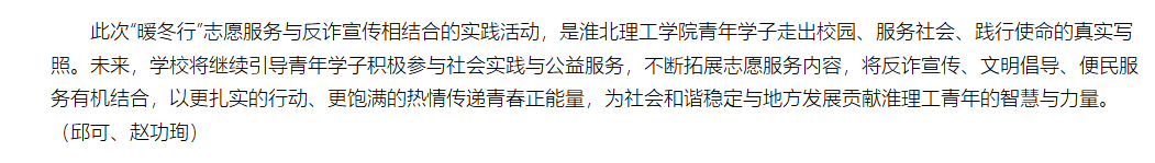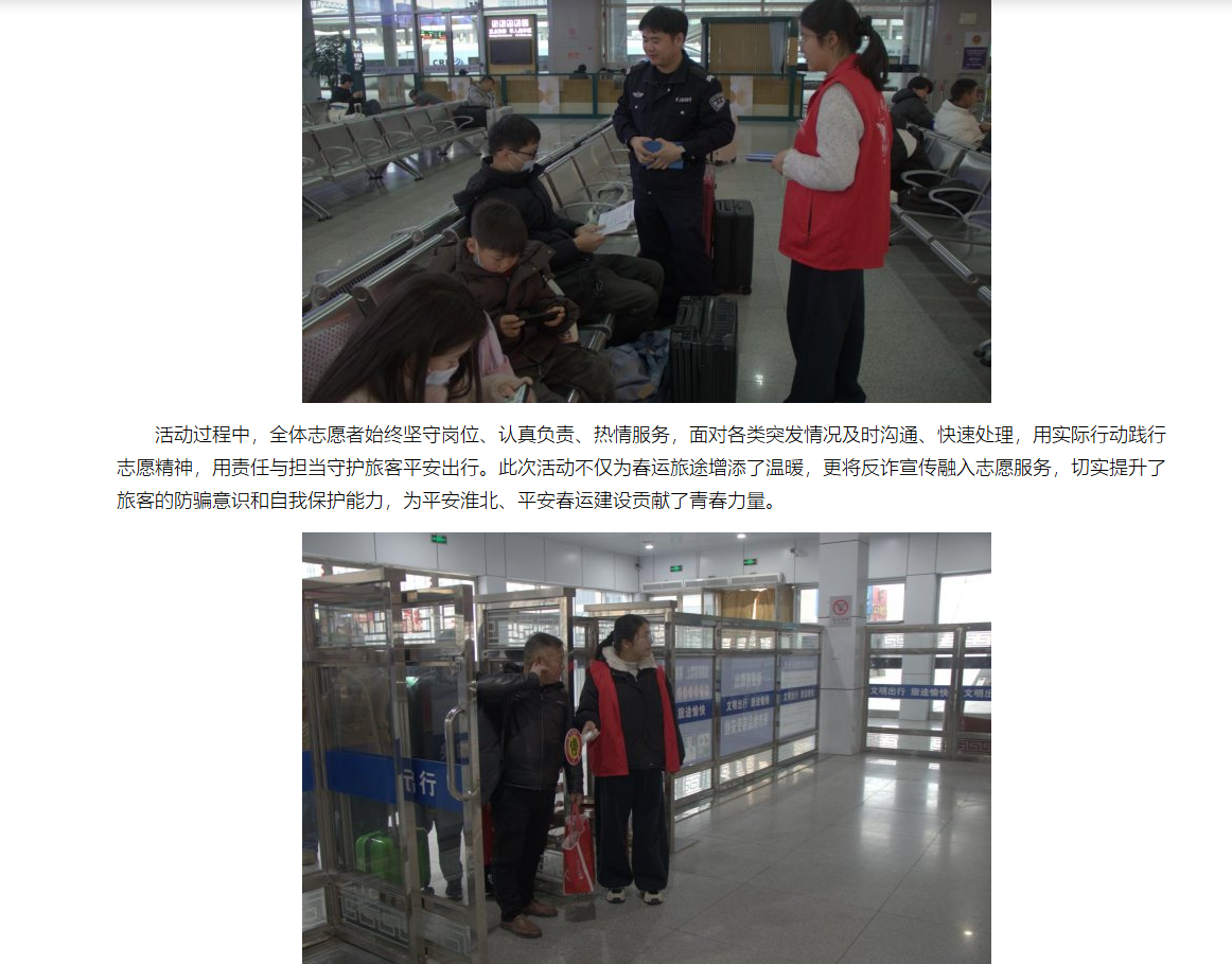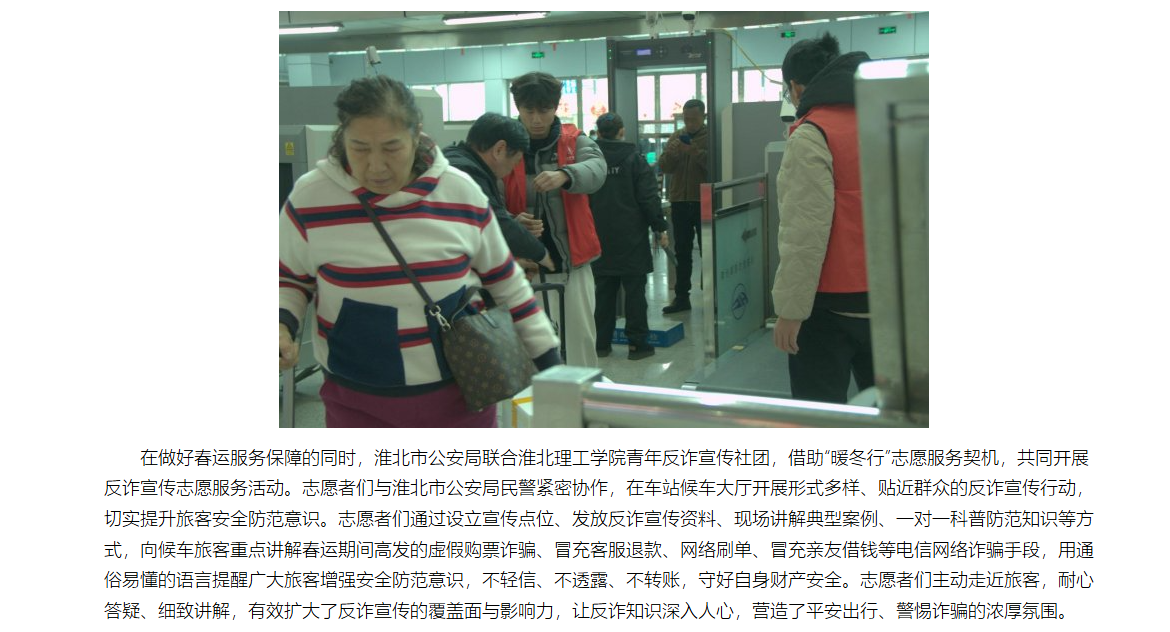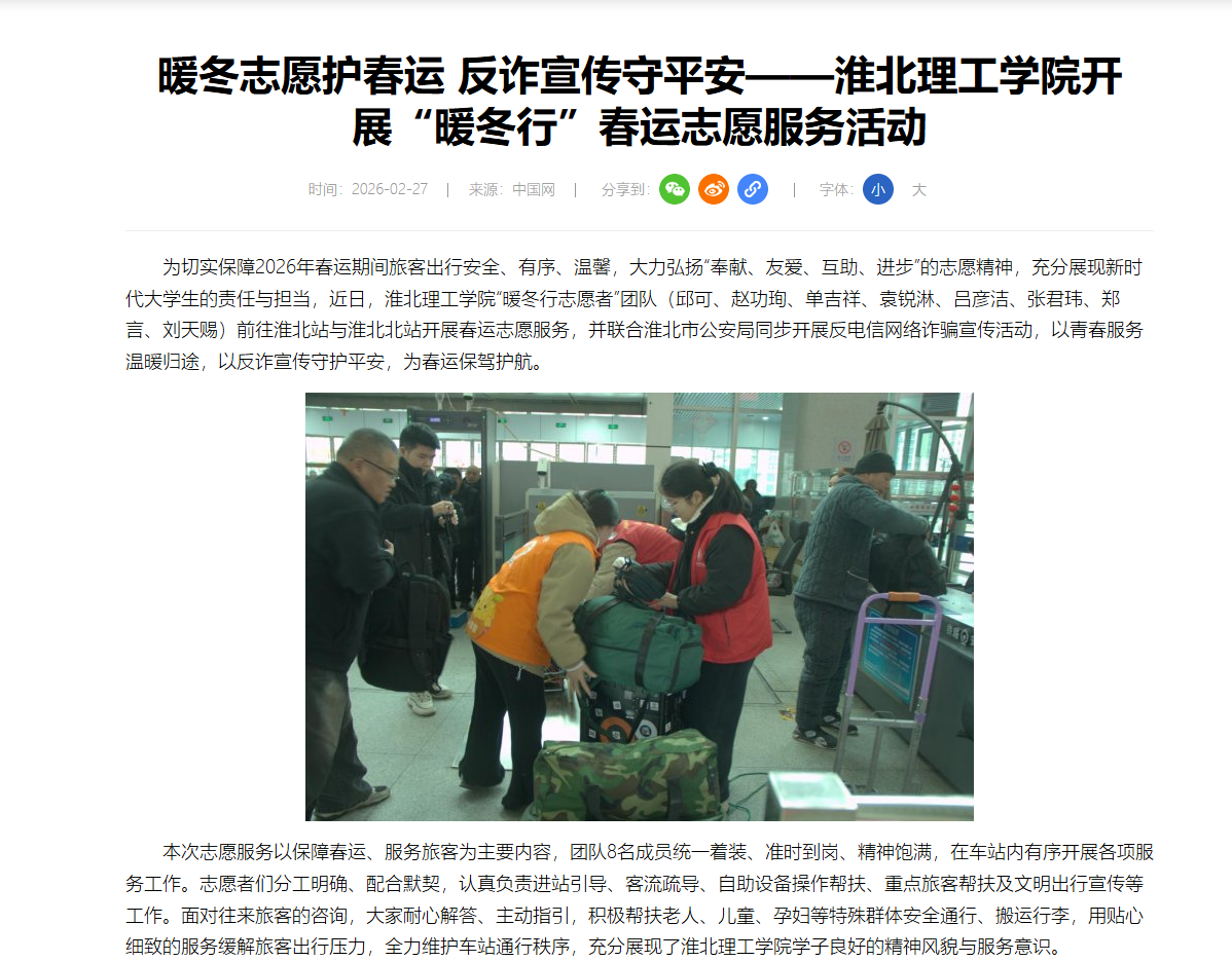 为切实保障2026年春运期间旅客出行安全、有序、温馨,大力弘扬“奉献、友爱、互助、进步”的志愿精神,充分展现新时代大学生的责任与担当,近日,beat365唯一官方网站“暖冬行志愿者”团队(邱可、赵功珣、单吉祥、袁锐淋、吕彦洁、张君玮、郑言、刘天赐)前往淮北站与淮北北站开展春运志愿服务,并联合淮北市公安局同步开展反电信网络诈骗宣传活动,以青春服务温暖归途,以反诈宣传守护平安,为春运保驾护航。对此,中国网进行了报道: