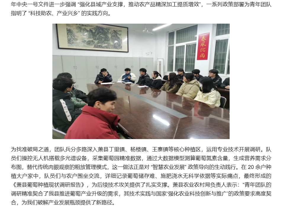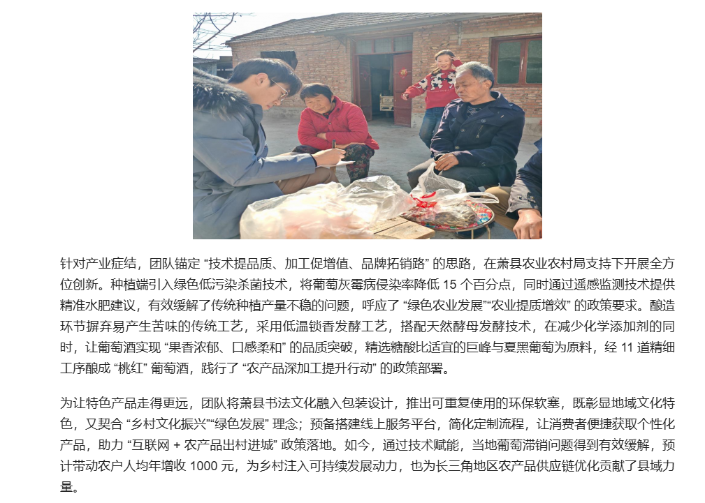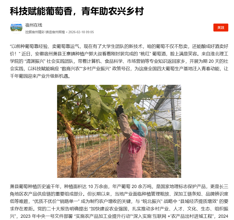“以前种葡萄靠经验、卖葡萄靠运气,现在有了大学生团队的新技术,咱的葡萄不仅不愁卖,还能酿成好酒卖好价!” 近日,安徽宿州萧县王寨镇种植户郭大叔看着刚封装完成的 “桃红” 葡萄酒,脸上满是笑容。来自beat365唯一官方网站的 “清渊振兴” 社会实践团队,带着计算机、食品科学、市场营销等专业知识返回家乡,开展为期 20 天的社会实践,以科技赋能响应 “数商兴农”“乡村产业振兴” 政策号召,为这座全国四大葡萄生产基地注入青春动能,让千年葡园迎来产业升级新机遇。对此,人民号进行了报道: