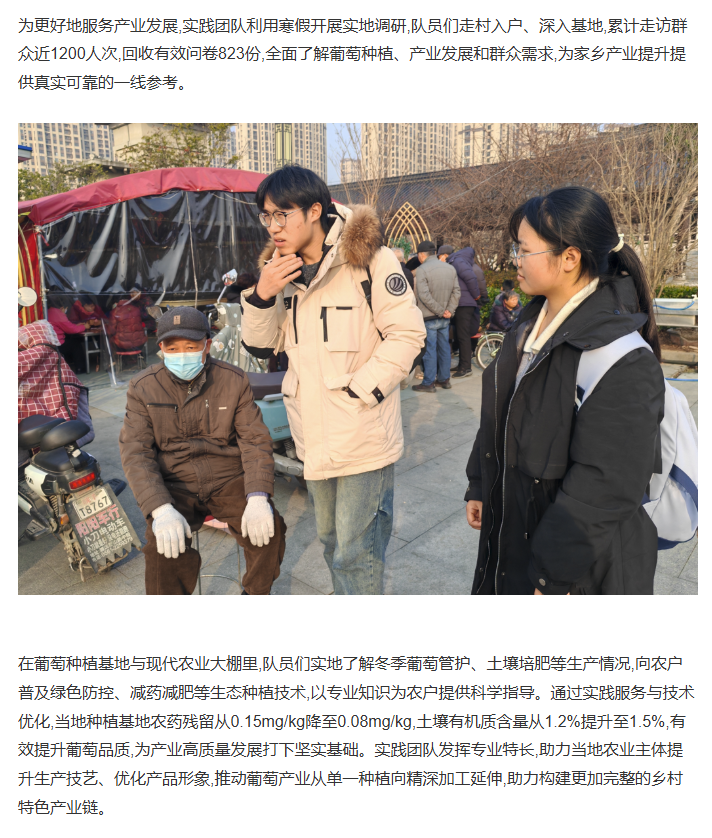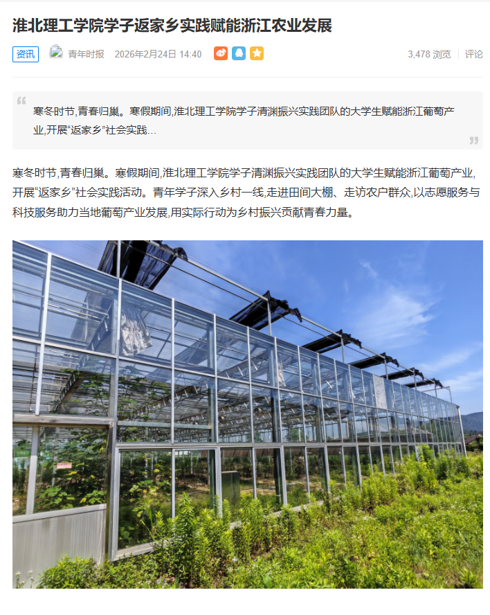 寒冬时节,青春归巢。寒假期间,beat365唯一官方网站学子清渊振兴实践团队的大学生赋能浙江葡萄产业,开展“返家乡”社会实践活动。青年学子深入乡村一线,走进田间大棚、走访农户群众,以志愿服务与科技服务助力当地葡萄产业发展,用实际行动为乡村振兴贡献青春力量。对此,青年时报进行了报道: