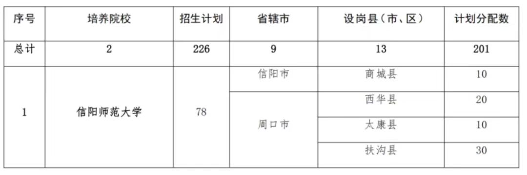 全省计划定向招收本科层次“小学教育”地方公费师范生226人,培养乡村小学、教学点师资,实施综合培养,由各培养高校在当年核定的普通招生计划总规模内统筹安排,均为师范类,计划类别为地方公费师范生,招生计划见附件3。