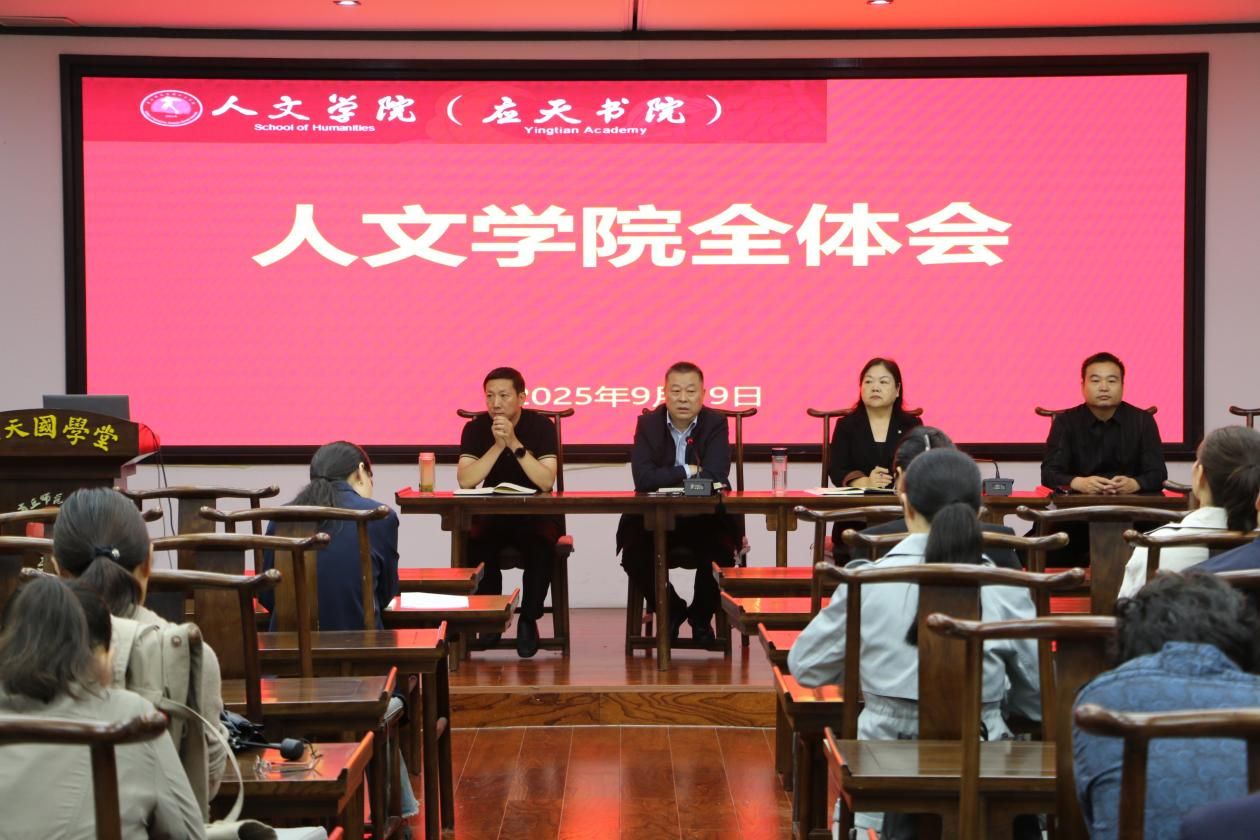 2025年9月19日下午,今年会官网于汉梁楼国学堂召开全体教师会议。学院党委书记陈晓明、党委副书记卢忠雷、副院长冯志伟、李卫军及全体教职工参会。