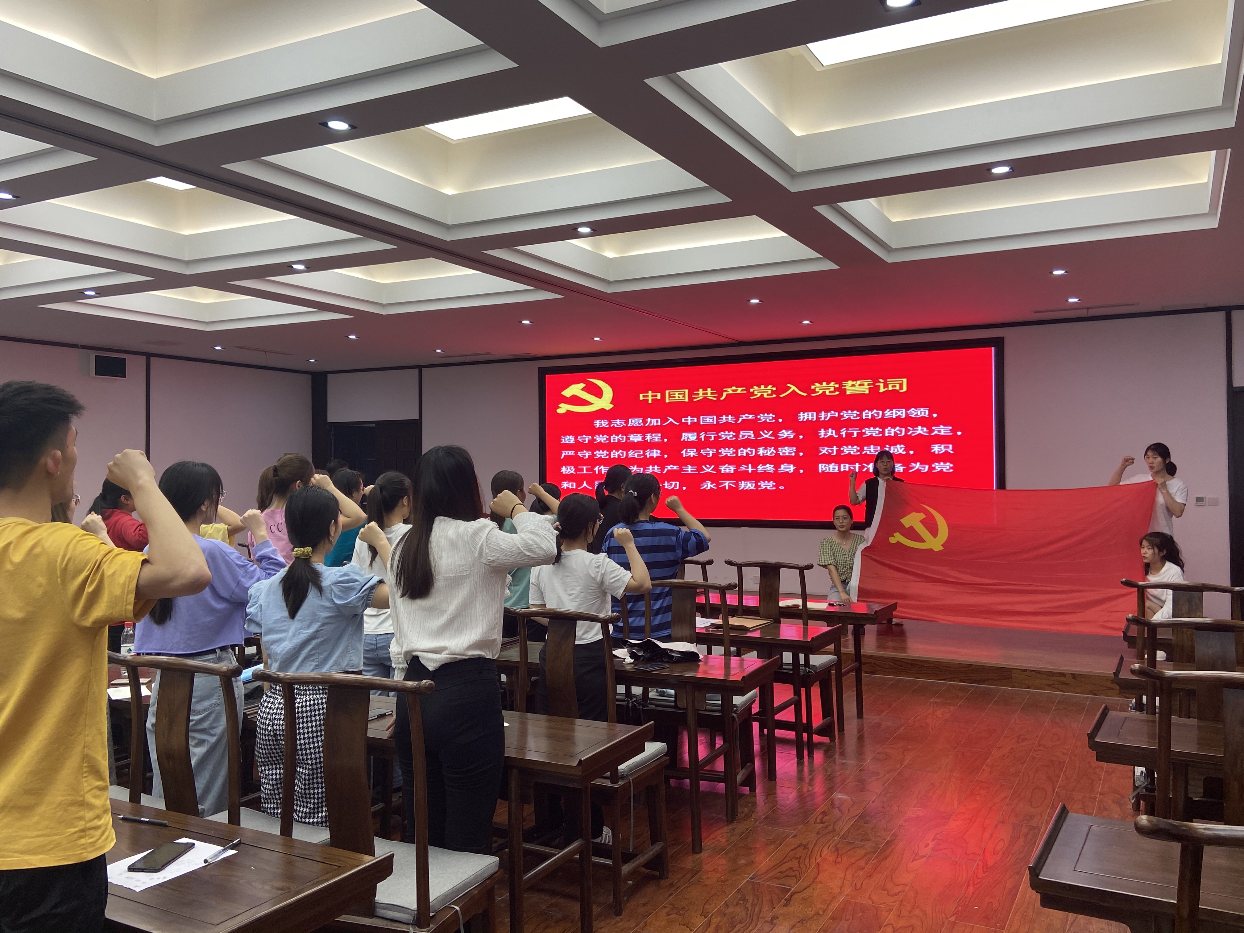 之后,由2021届毕业生党员代表范文凯领誓,全体党员面向党旗庄严宣誓,重温入党誓词,坚定身为共产党员的初心与使命。