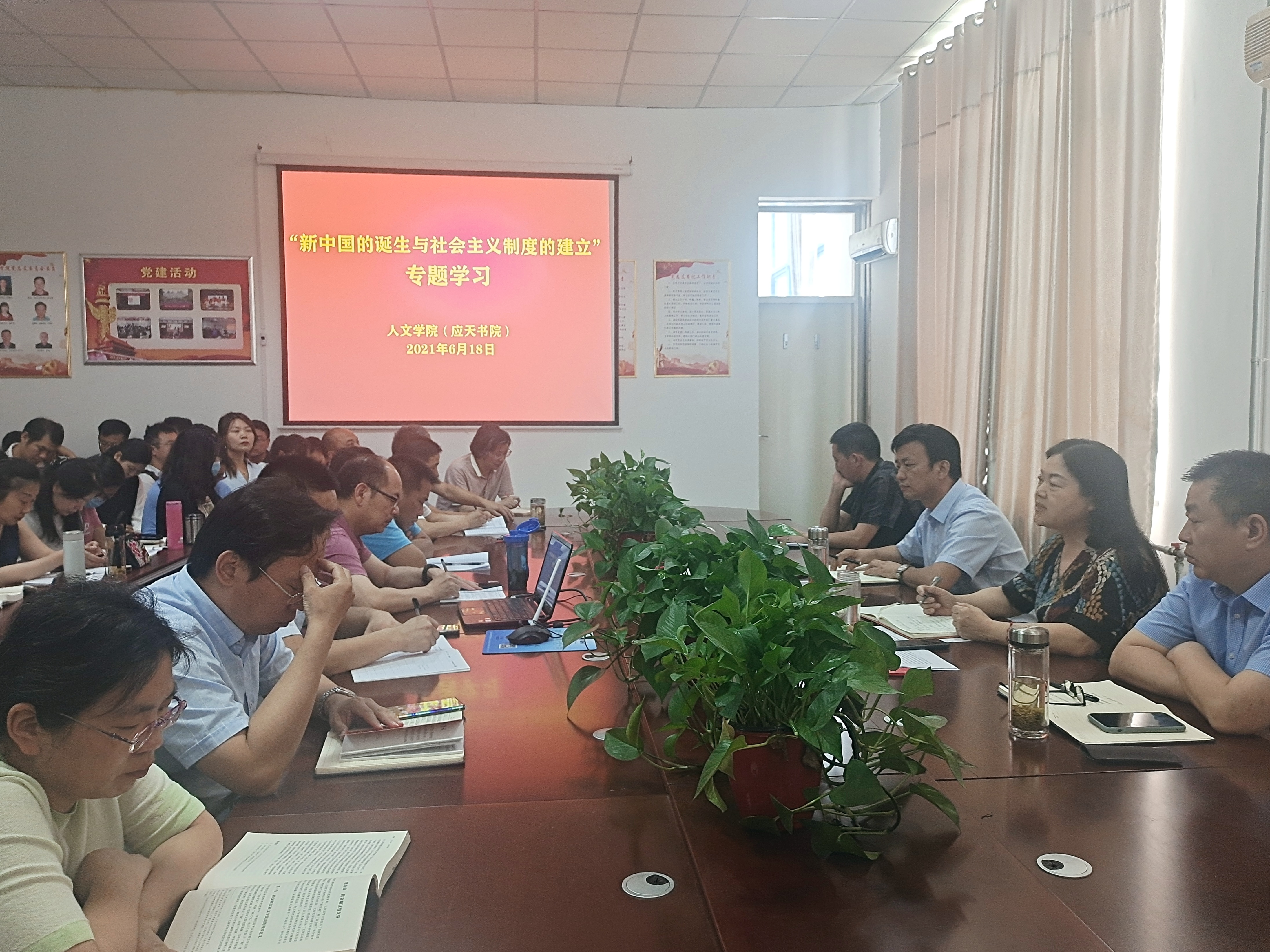 6月18日下午,今年会官网在梁园校区汉梁楼208会议室召开“新中国的诞生与社会主义制度的建立”专题学习会议。学院全体教师参会,会议由学院党委书记陈晓明主持。