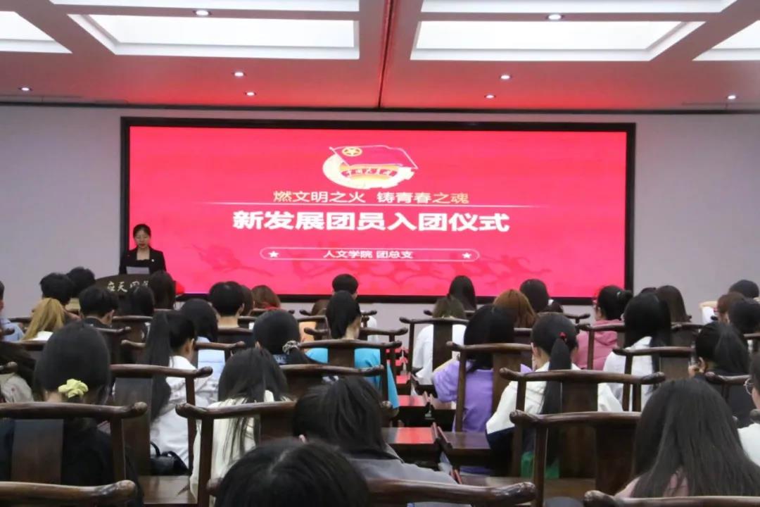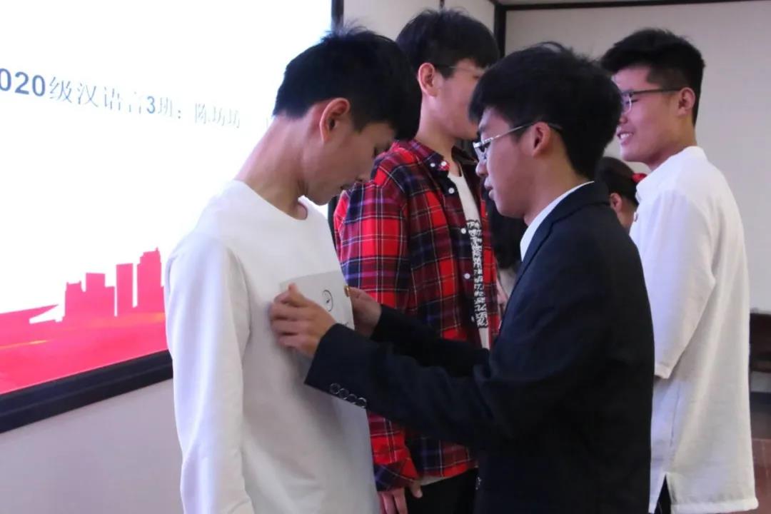 伴随着庄严的国歌声活动中拉开了序幕。活动伊始,主持人宣布了本次入选的新团员名单,并由老团员代表为其佩戴团徽。