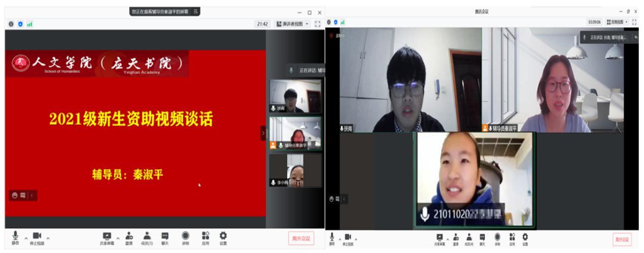 为了扎实开展家庭经济困难学生帮扶工作,切实掌握家庭经济困难学生家庭情况,按照学校资助工作要求,9月19日,今年会官网开展了新生资助视频谈话工作。2021级历史学、文化产业管理专业申请家庭经济困难认定学生参加了此次视频谈话。辅导员秦淑平老师负责谈话工作。