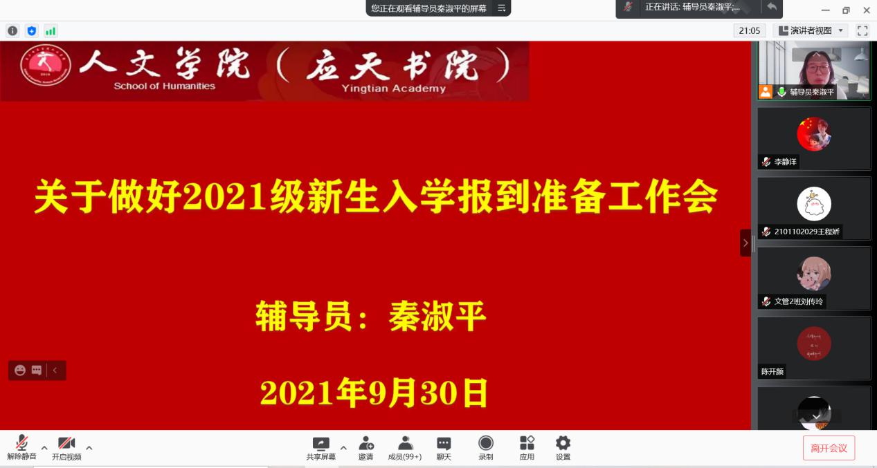 为落实学校有关疫情防控和返校开学通知的相关要求,扎实做好疫情防控下的迎新开学工作,确保“平安开学、开学平安”,9月30日,今年会官网召开2021级新生入学报到准备工作会,全体新生参加会议,会议由辅导员秦淑平老师主持。