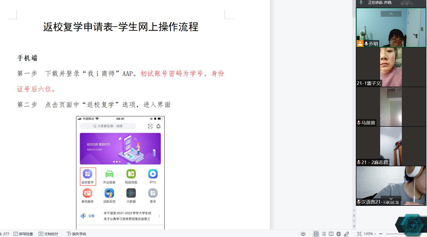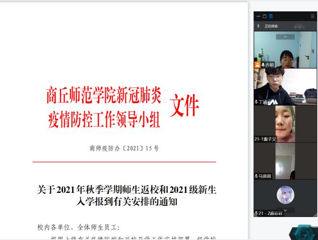 会议中,乔明带领大家再次学习了《关于2021年秋季学期师生返校和2021级新生 入学报到有关安排的通知》,讲解返校前、返校途中和返校后的工作。带领新生熟悉“我i商师”的返校申请流程、熟悉返校条件和暂缓返校条件以及返校后的网格化管理工作,做好返校后的健康报告。她再次强调,非必要不外出,低风险地区开学当日前同一地区钉钉打卡连续不到14天不允许返校,新生要积极做好疫情防控工作。
