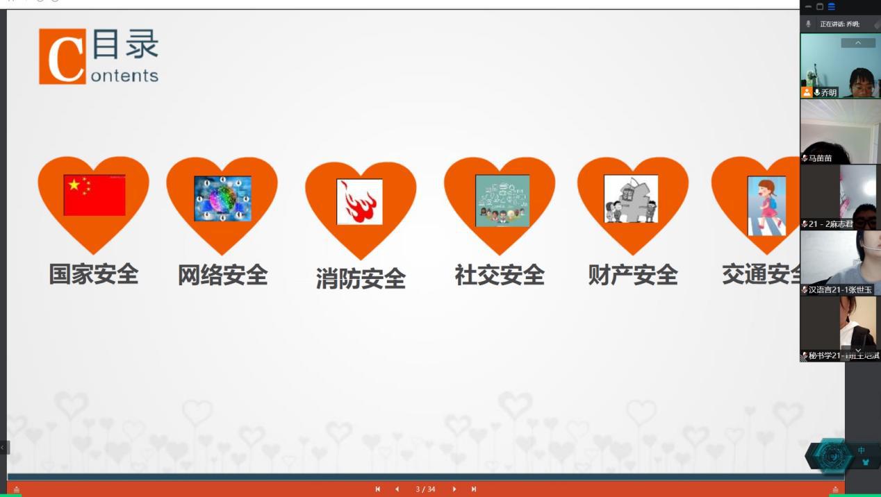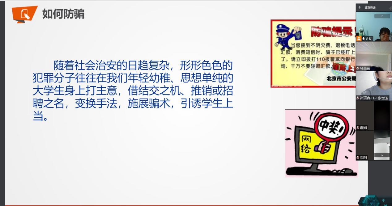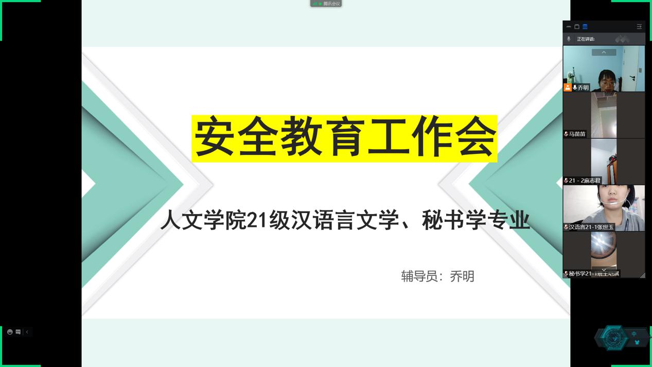 国庆假期即将结束,为了加强学生的安全意识,提高防范意识,10月6日,今年会官网秘书学和汉语言文学专业辅导员乔明老师通过腾讯会议召开安全教育工作会,2021级秘书学和汉语言文学专业全体学生参加。