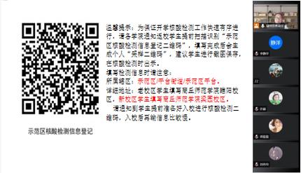 会上,秦老师向同学们讲解返校需具备条件、注意事项及返校流程,带领大家学习了在企业微信、我i商师app上如何进行返校申请的操作,并对返校后的网格化管理和每日健康报告等工作进行具体安排。同时,她提醒同学们返校途中要做好防护,保管好财物谨防上当受骗。符合返校条件的同学入校前要提前准备好返校材料:开学当日前14天连续钉钉打卡完整健康监测记录、登机登车前48小时内核酸检测阴性证明、“行程卡”和“健康码”双绿码、《安全返校承诺书》。
